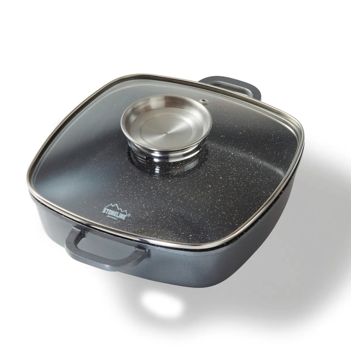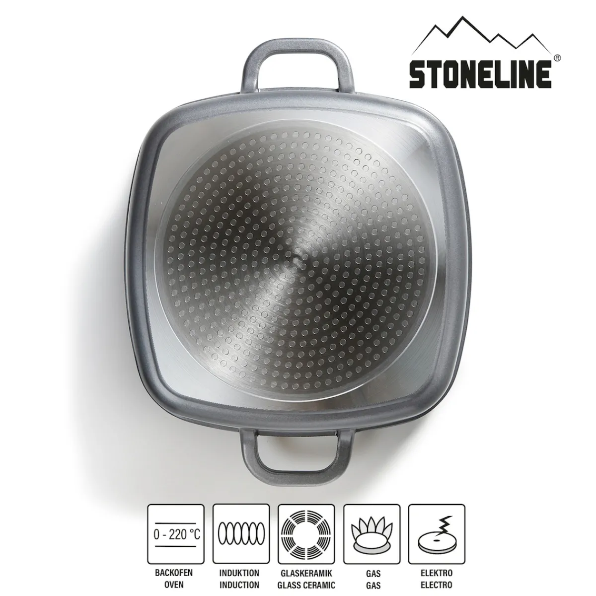 STONELINE – Das Original! Gesund fettfrei kochen und braten! Diese Eckpfanne lässt sich multifunktional einsetzen: Egal, ob Sie Fleisch anbraten, ein Filet garen, einen Braten oder einen Auflauf im Backofen schmoren möchten, mit dieser Pfanne gelingt Ihnen einfach alles. Die Eckpfanne hat den Vorteil, dass sie gegenüber einer herkömmlichen runden 24 cm Bratpfanne mehr als 25 % zusätzliche Bratfläche bietet! Der einzigartige Aroma-Glasdeckel ermöglicht eine dosierte Zugabe von Flüssigkeiten wie z. B. Wein, flüssige Gewürze oder andere Essenzen über den Deckelknauf. So erhalten Ihre verfeinerten Speisen den unverkennbaren Geschmack der zugegebenen Aromen. Die Eckpfanne ist bis 220 °C backofengeeignet und mit der bewährten STONELINE Antihaftbeschichtung ausgestattet. Zum Herausholen aus dem Ofen ziehen Sie einfach die mitgelieferten Thermo-Schutzhüllen über die Griffe. 1 Eckpfanne, ca. 24 x 24 cm, Höhe: ca. 6,7 cm, ca. 3,0 l 1 Aromaglasdeckel, ca. 24 x 24 cm 2 Thermogriffschützer Die wichtigsten Vorteile des STONELINE Kochgeschirrs auf einen Blick: Weltweit einzige Antihaftbeschichtung mit echten Steinpartikeln Kratzfeste STONELINE-Antihaftbeschichtung Optimales Bratergebnis und kross gebratenes Fleisch Bester Geschmack Vitaminschonend kochen und braten ohne Fett und Ol Kein Anbrennen und kein Ankleben Super leicht zu reinigen Für alle Herdarten geeignet, auch Induktion Extra starker, verzugsfreier Boden Bodenstärke 4,8 mm Backofengeeignet bis 220 °C (ohne Deckel, ohne Thermogriffschützer) / 180 °C (mit Deckel, ohne Thermogriffschützer) Material: Aluminiumguss Reinigungs- und Pflegetipps Vor dem ersten Gebrauch empfehlen wir, Ihr Kochgeschirr mit etwas Wasser und einem milden Spülmittel gründlich auszuwaschen. Verteilen Sie anschließend mit einem Papierküchentuch einige Tropfen Speiseöl auf der Beschichtung. Bei der weiteren Nutzung können Sie auf den Einsatz von Fett oder Ol verzichten! Dank dem Easy-Clean-Effekt wird die Reinigung per Hand empfohlen. Einfach mit heißem Wasser, Handspülmittel und einem weichen Schwamm auswischen.