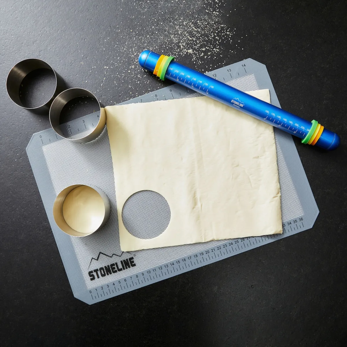 STONELINE – Das Original! Die ideale Grundlage, um Ihren Teig in die richtige Form zu bringen, die Arbeitsfläche sauber zu halten und eine backpapierfreie Küche zu erhalten. Bedruckt mit Maßangaben für die optimale Teiggröße. Legen Sie die Backmatte flach auf die Arbeitsfläche. Positionieren Sie den Teig in der Mitte der Matte und rollen Sie ihn auf die gewünschte Größe aus. Legen Sie den ausgerollten Teig entweder in die entsprechende Kuchenform oder direkt mit der Matte auf das passende Backblech. Dank der praktischen Antihaftwirkung ist kein Bestäuben mit Mehl oder Einfetten notwendig und die Arbeitsfläche bleibt sauber. Dieses 2-teilige Set besteht aus:1 kleine Backmatte, ca. 29,5 cm x 21 cm1 große Backmatte, ca. 42 x 29,5 cm Hitzebeständigkeit bis 220 °CMit Antihaft-EffektFür alle handelsüblichen Backbleche geeignetGeruchsneutralWiederverwendbarMaterial: Glasfaser mit Silikonbeschichtung