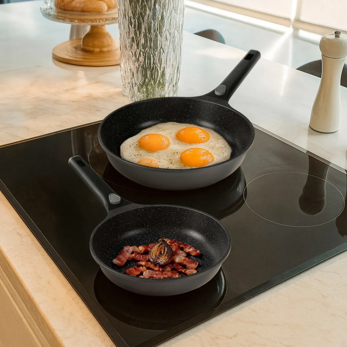 STONELINE – Das Original! Gesund fettfrei kochen und braten! STONELINE Smart – Das intelligente Kochgeschirr für deine Küche Mit der STONELINE Smart Serie wird Kochen, Backen und Servieren so einfach und flexibel wie nie zuvor! Das hochwertige Kochgeschirr aus Aluguss kombiniert durchdachte Funktionen mit modernem Design, langanhaltender Qualität und maximalem Komfort. Der abnehmbare Griff macht das Kochgeschirr besonders vielseitig: Spare Platz bei der Zubereitung auf dem Herd, beim Servieren auf dem Esstisch und bei der Aufbewahrung im Kühlschrank. Außerdem wird dein Kochgeschirr mit abgenommenen Griffen im Handumdrehen ofenfest. Du kannst die Pfannen beispielsweise als Auflaufformen zum Überbacken von Gerichten verwenden. Das spart Zeit und auch zusätzliches Koch- und Backgeschirr. Das 2-teilige Pfannenset bietet dir die Flexibilität, zwischen zwei verschiedenen Größen zu wählen, sodass du immer die perfekte Pfanne für dein Gericht hast. Die Bratpfannen sind sehr geräumig und bieten ausreichend Platz, um auch größere Portionen problemlos zuzubereiten und zu wenden. So bleibt alles in der Pfanne und du kannst dein Gericht perfekt zubereiten, ohne dass etwas herausfällt. Ob Pfanne, Topf oder ganzes Topfset – die STONELINE Smart Serie überzeugt durch ihr robustes Aluminiumguss-Material und garantiert eine optimale Wärmespeicherung und ein energieeffizientes Kochen. Es ist für alle Herdarten geeignet, auch für Induktion. Dank der patentierten STONELINE Antihaftbeschichtung mit echten Steinpartikeln kannst du gesund fettfrei braten, ohne dass etwas haften bleibt oder anbrennt. Die Reinigung ist kinderleicht und spart dir Zeit – meist genügt es, die Pfanne oder den Topf einfach mit etwas Spülmittel, heißem Wasser und einem feuchten Tuch auszuwischen und das Kochgeschirr ist sofort wieder einsatzbereit. Lieferumfang: 1 Bratpfanne, ø ca. 24 cm, Höhe: ca. 5,5 cm, ca. 2,0 l, Induktionsboden: ø ca. 16 cm1 Bratpfanne, ø ca. 28 cm, Höhe: ca. 6 cm, ca. 3,0 l, Induktionsboden: ø ca. 20 cmIn der Farbe: Grau Die wichtigsten Vorteile auf einen Blick: Weltweit einzige Antihaftbeschichtung mit echten Steinpartikeln Kratzfeste STONELINE-Antihaftbeschichtung Abnehmbare Griffe für flexible Einsatzmöglichkeiten Vitaminschonend kochen und braten ohne Fett und Öl Optimales Bratergebnis und kross gebratenes Fleisch Auch für Vegetarier geeignet: Gemüse bleibt knackig und saftig Kein Anbrennen und kein Ankleben Super leicht zu reinigen dank Easy-Clean Effekt Extra starker, verzugsfreier Boden Bodenstärke: ca. 4,5 mm Für alle Herdarten geeignet, auch Induktion Backofengeeignet bis 260 °C (ohne Griff) / 220 °C (mit Griff) Material: Aluminiumguss Reinigungs- und Pflegetipps: Vor dem ersten Gebrauch empfehlen wir, dein Koch- oder Backgeschirr mit etwas Wasser und einem milden Spülmittel gründlich auszuwaschen. Verteile anschließend mit einem Papierküchentuch einige Tropfen Speiseöl auf der Beschichtung.Bei der weiteren Nutzung kannst du auf den Einsatz von Fett oder Öl verzichten!Dank dem Easy-Clean-Effekt wird die Reinigung per Hand empfohlen. Einfach mit heißem Wasser, Handspülmittel und einem weichen Schwamm auswischen.