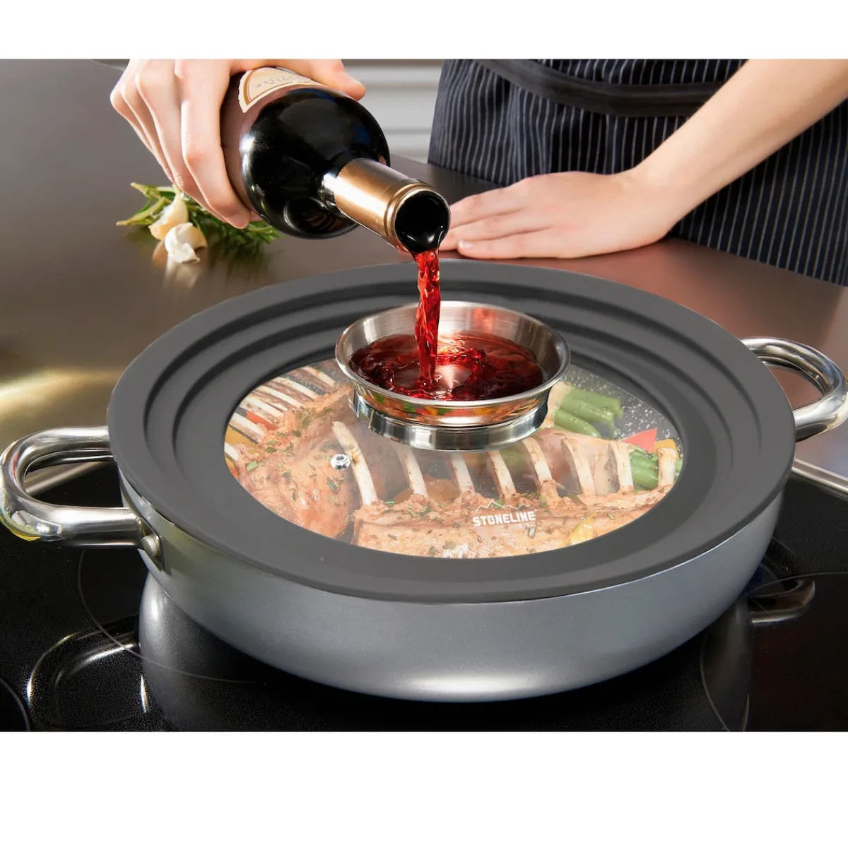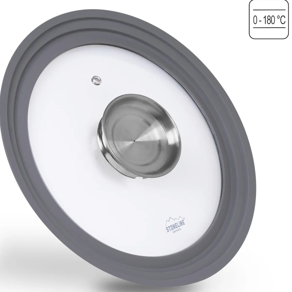 STONELINE – Das Original! Sie kennen wahrscheinlich das Problem, eine komplette Schublade voll mit unzähligen Glasdeckeln zu haben und dennoch finden Sie den passenden Deckel für Ihre Pfanne oder Ihren Topf nicht. Nun ist Schluss mit dem „Deckel-Chaos“ – dank des Universalglasdeckels von STONELINE! Der Universalglasdeckel von STONELINE mit Silikonrand passt auf drei verschiedene Pfannen- und Topfgrößen und verfügt über die einzigartige Aroma-Funktion! Der Aroma-Glasdeckel ermöglicht eine dosierte Zugabe von Flüssigkeiten wie z. B. Wein, flüssige Gewürze oder andere Essenzen über den Deckelknauf. So erhalten Ihre verfeinerten Speisen den unverkennbaren Geschmack der zugegebenen Aromen. Der Silikonrand schont die Oberfläche des Kochgeschirrs und macht den Glasdeckel bruchsicherer. 1 Aroma-Glasdeckel mit Silikonrand für die Größen ø 24/26/28 cm 1 Deckel für 3 Größen: Passend für alle Töpfe und Pfannen von ø 24 bis 28 cm Aroma-Funktion ermöglicht dosierte Zugabe von Flüssigkeiten Sichtfenster aus Glas Mit Dampfauslass Silikonrand schont die Beschichtung und macht den Deckel bruchsicherer Hitzebeständig bis 180 °C Material: Glas, Edelstahl, Silikon