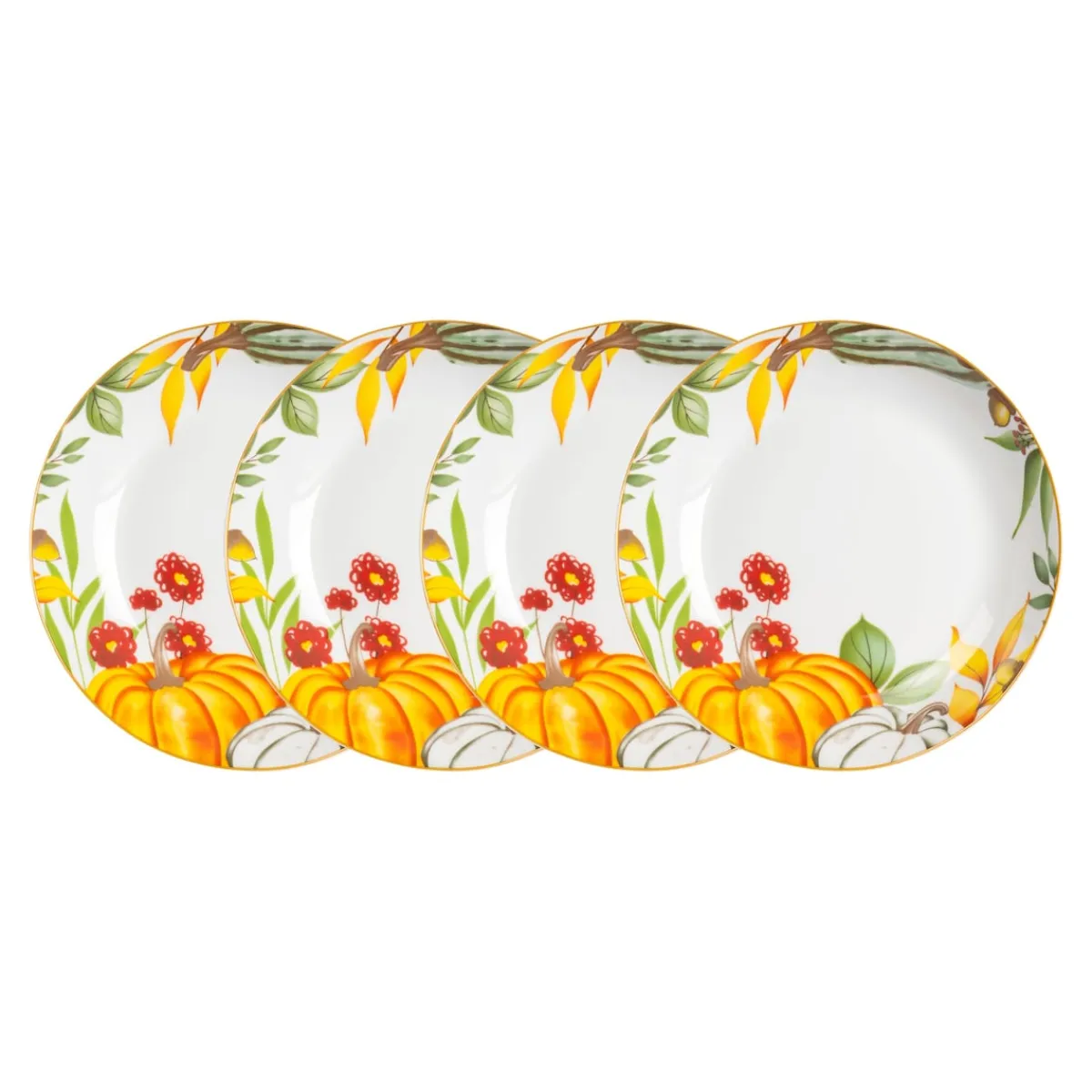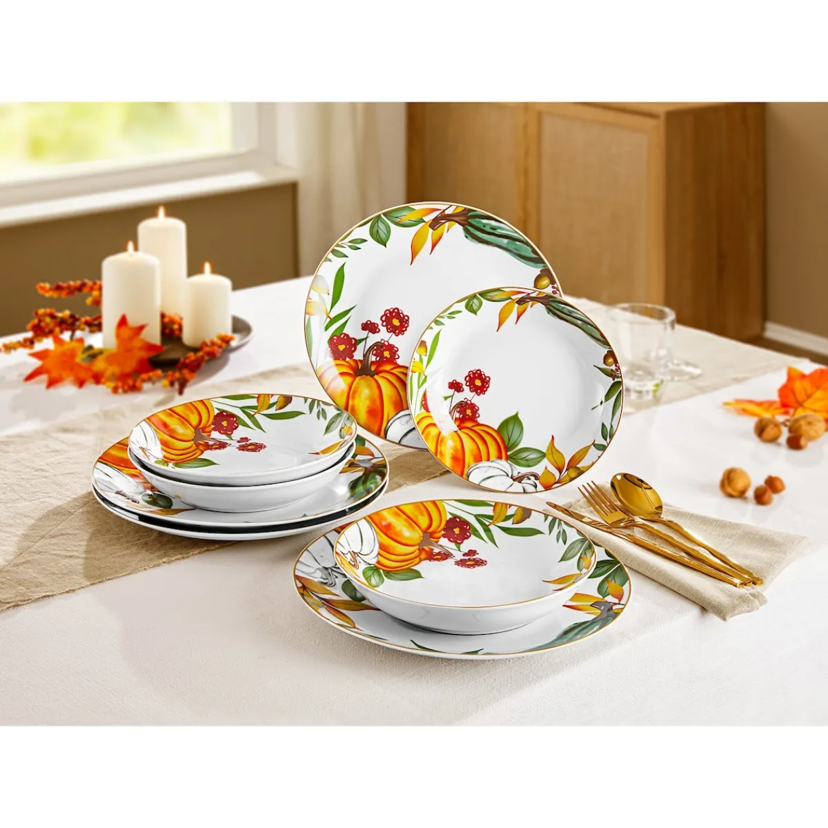 Das Suppenteller-Set bringt herbstliche Stimmung auf Ihren Tisch. Mit seinem fröhlichen Herbst-Design präsentiert es nicht nur leckere Kürbisgerichte auf schönste Weise. Ob Suppen, Gemüse oder Fleisch – diese dekorativen Teller verwandeln jedes Menü in ein herbstliches Festmahl. Genießen Sie stilvolle Mahlzeiten und zaubern Sie ein Lächeln auf die Gesichter Ihrer Gäste. Ideal für gemütliche Herbstabende und festliche Anlässe.