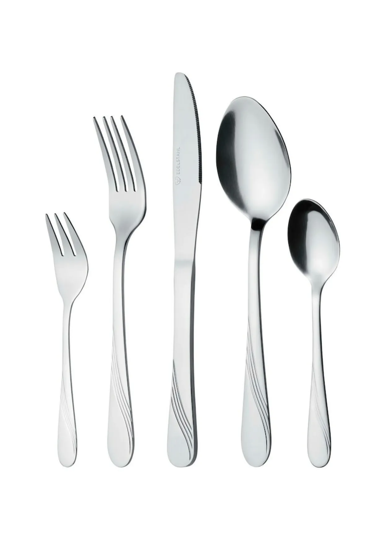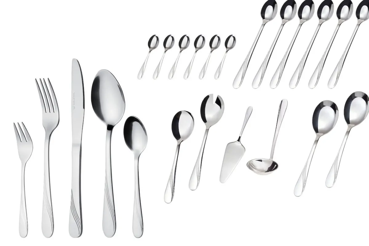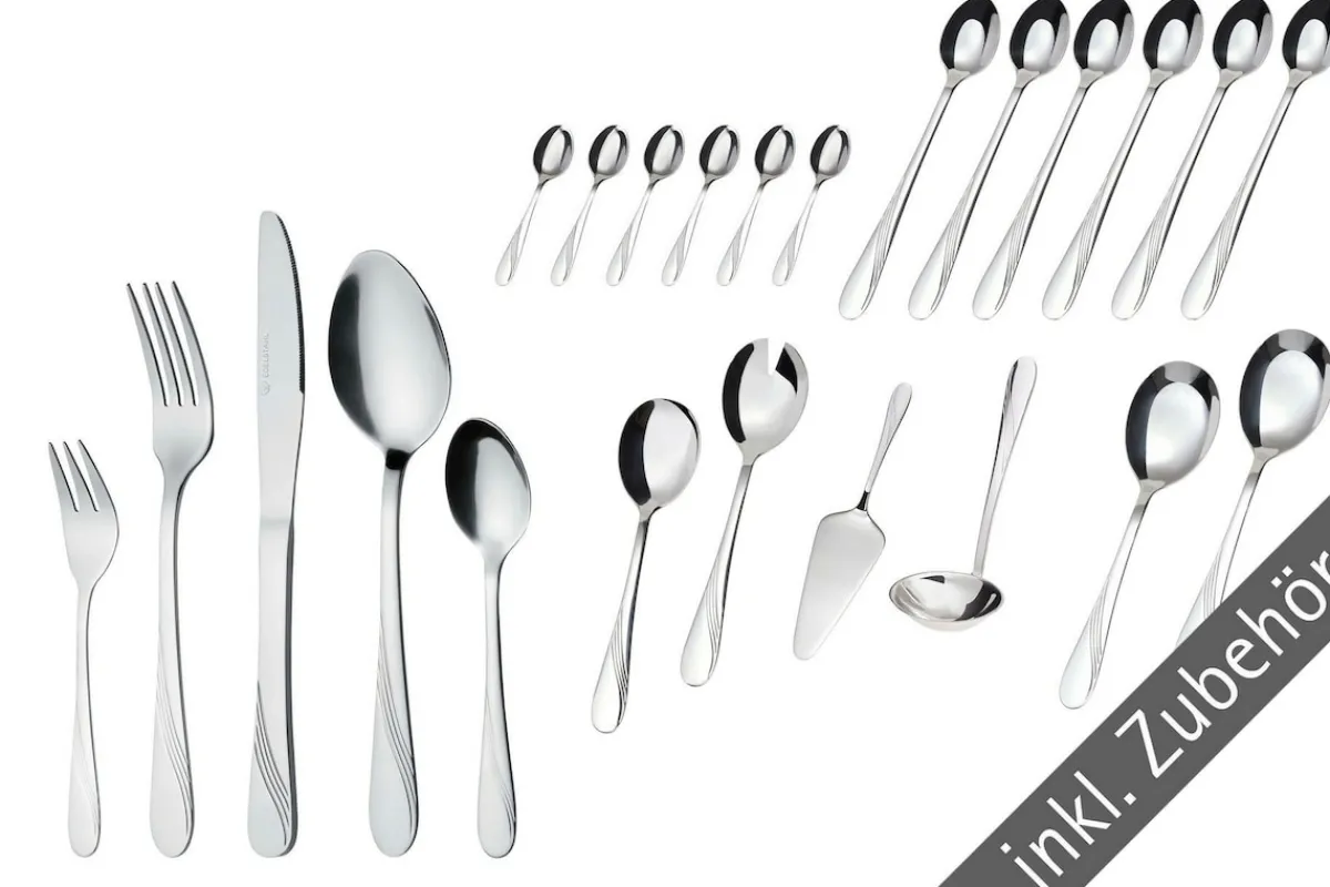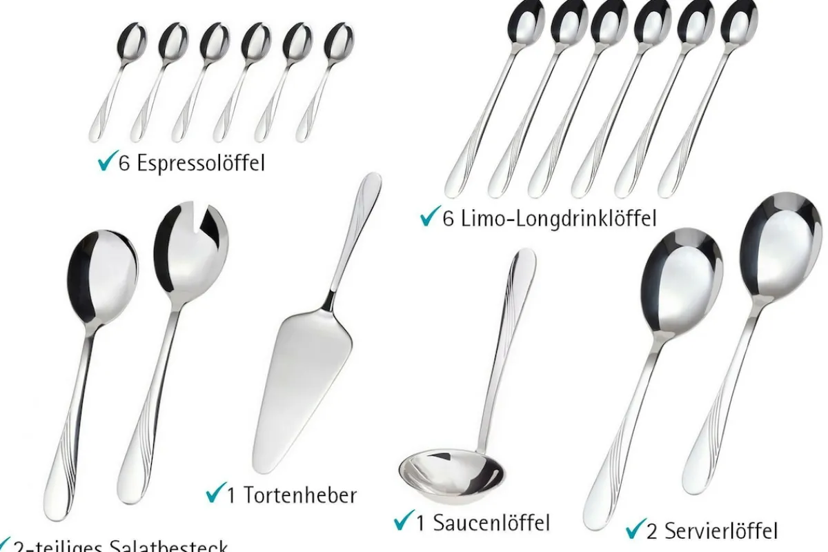 Lieferumfang: 6 Gabeln, 6 Löffel, 6 Messer, 6 Kaffeelöffel, 6 Kuchengabeln, 6 Longdrinklöffel, 6 Espressolöffel, 1 Tortenheber, 1 Soßenlöffel, 2-teiliges Salatbesteck, 2 Servierlöffel.