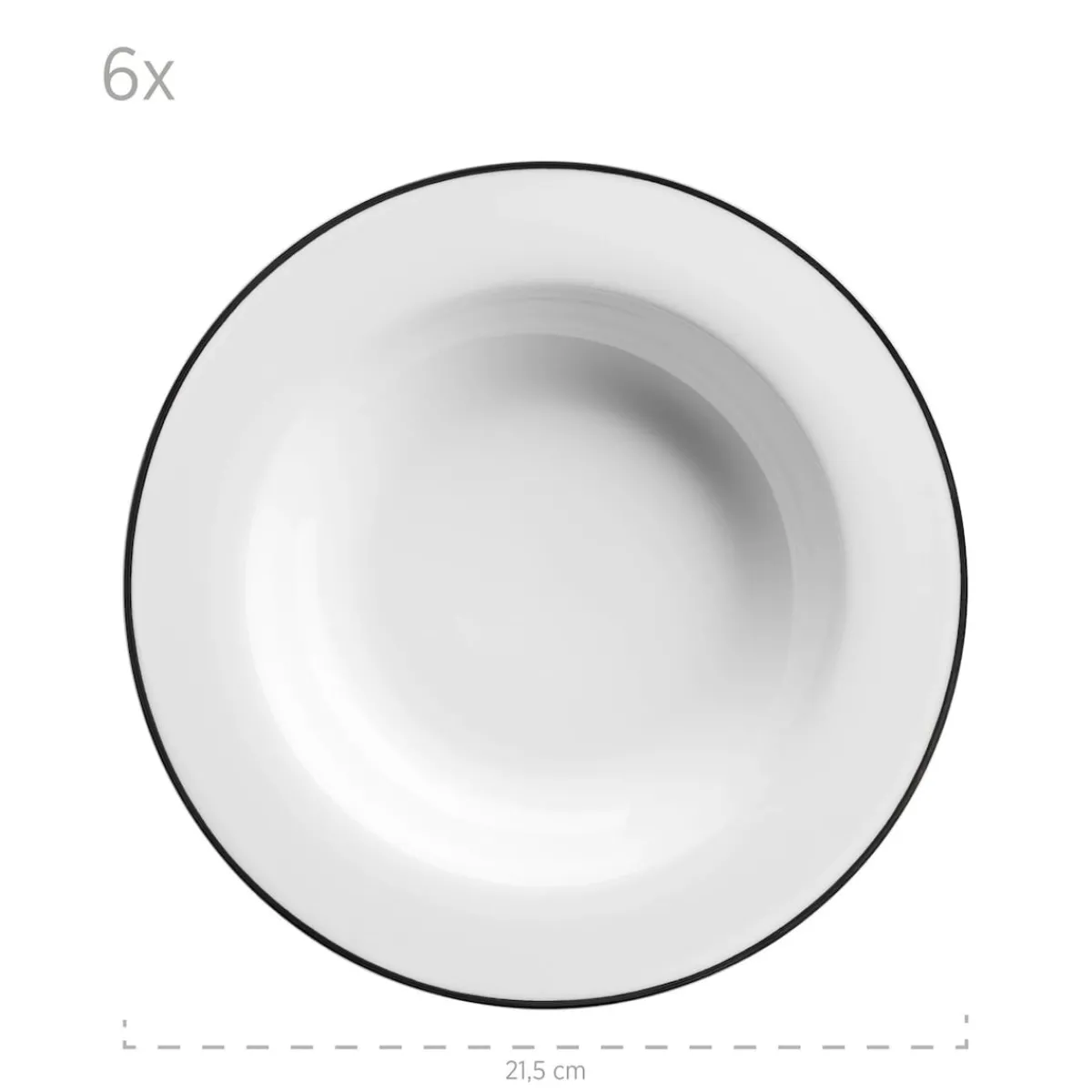 Das stilvolle Tafelservice Nola ist das ideale Geschirrset für den täglichen Einsatz als Essgeschirr für bis zu 6 Personen. Das praktische Set besteht aus 6x Speisetellern und 6x Suppentellern in normaler Größe. Das hochwertige Porzellan in klassischem Weiß hat einen dünnen schwarzen Rand, welcher dem Set einen edlen, optischen Akzent verpasst und sich perfekt in modern, aber auch in klassisch eingerichtete Wohnungen einfindet. Das Set kann nach jeder Verwendung einfach von Hand oder in der Spülmaschine gereinigt werden und ist zudem zum Aufwärmen in der Mikrowelle geeignet. Das Service wird zum Versand in einen vielfach auf bruchsicherheit geprüften Karton verpackt. Perfekt kombinierbar mit dem dazu passenden Kaffeeservice im gleichen Design.