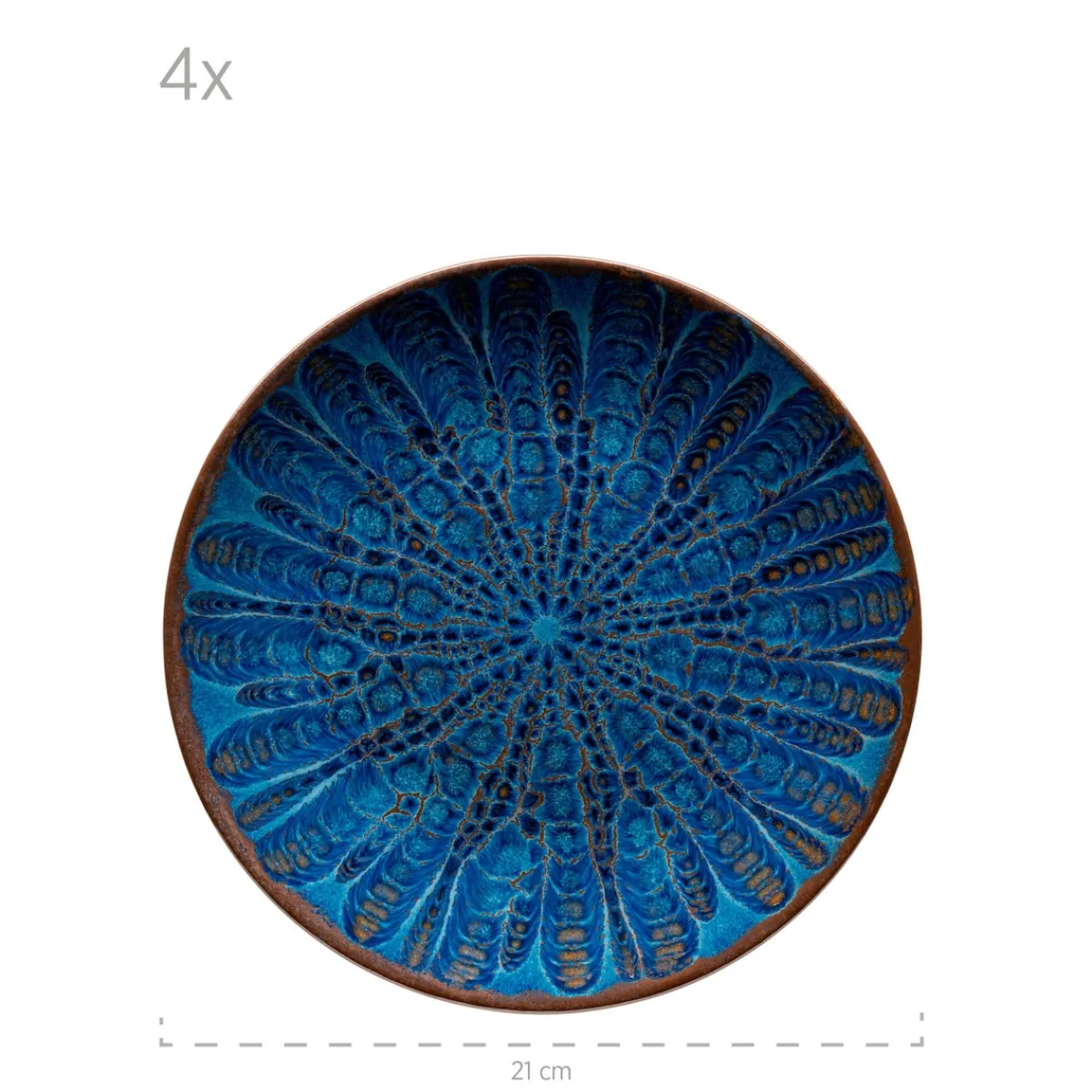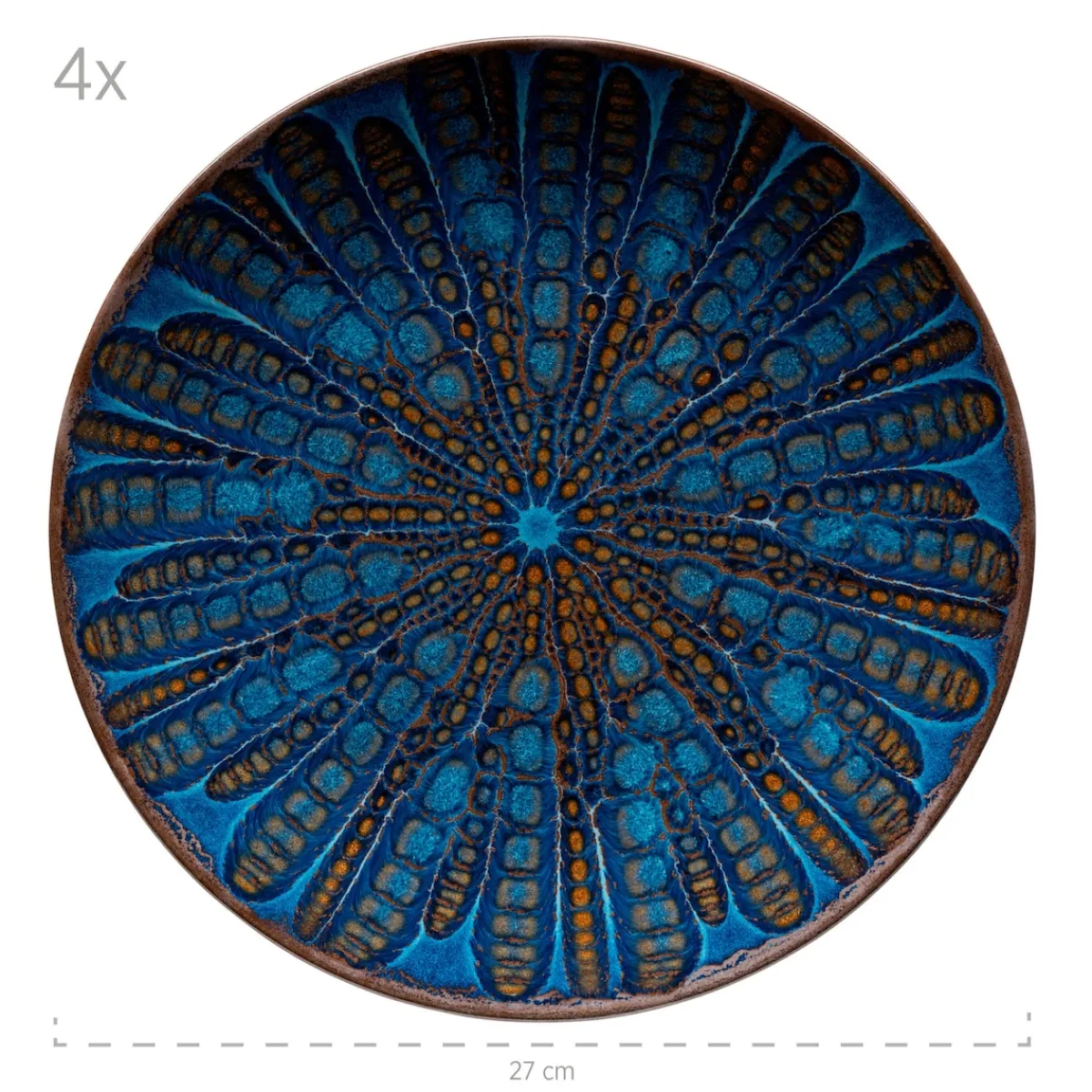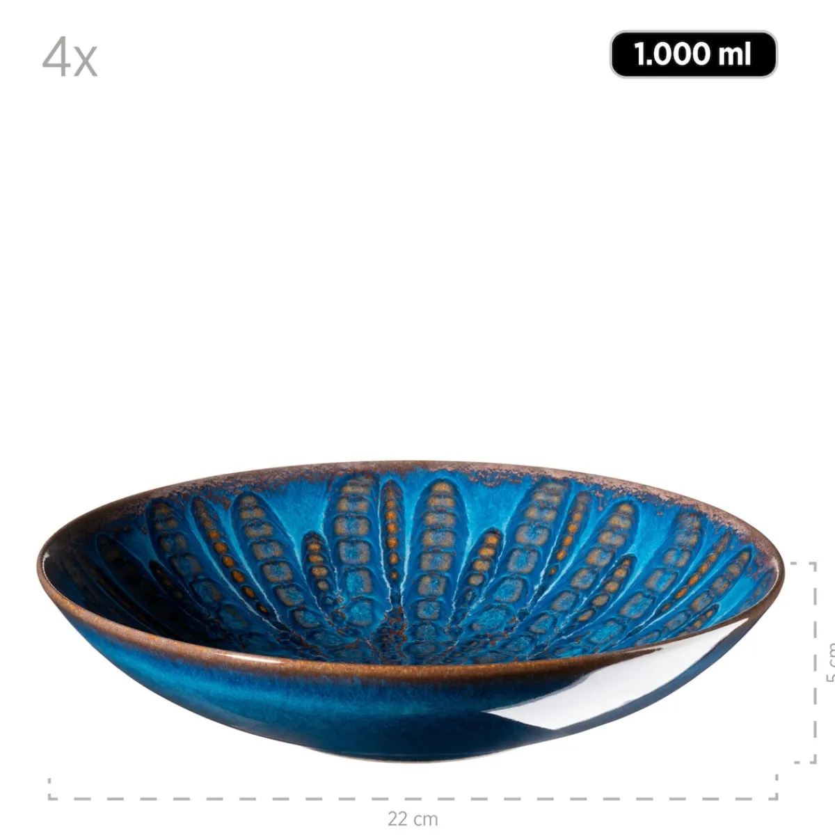 Tiefblaue Farben fließen bei der Keramikgeschirr-Kollektion „Aquamarine“ der österreichischen Traditionsmarke MÄSER über naturfarbene Dekore und bilden auf jedem Teller und jeder Schale ein einzigartiges Muster aus. Die besondere Glasurtechnik dieser außergewöhnlichen Essgeschirr-Serie macht jedes Teil zu einem echten Unikat! Die Kollektion Aquamarine wird in Portugal unter ressourcenschonenden Bedingungen aus regional gewonnenem Steinzeug gefertigt. Bei Steinzeug handelt es sich um eine hochwertige Form der Keramik, welche nicht mit dem brüchigeren und poröseren Steingut zu verwechseln ist. In seiner täglichen Handhabung unterscheidet sich hochwertiges Steinzeuggeschirr kaum von Porzellangeschirr: Die gesamte Serie ist mikrowellen- und spülmaschinengeeignet, hitzebeständig und tiefkühlgeeignet und damit absolut alltagstauglich. Dieses Service Set wird in einer vielfach auf Bruchsicherheit getesteten Paketversandverpackung aus umweltfreundlichen Materialien versendet. Bitte beachten Sie: Durch die besondere Glasurtechnik können minimale Unebenheiten in der Glasur auftreten, ebenso tragen Farbabweichungen zwischen verschiedenen Teilen zum typischen, lebendigen Charakter dieser Kollektion bei. Zur besseren objektiven Vergleichbarkeit gehen unsere Füllmengenangaben stets von einer randvollen Befüllung aus.
