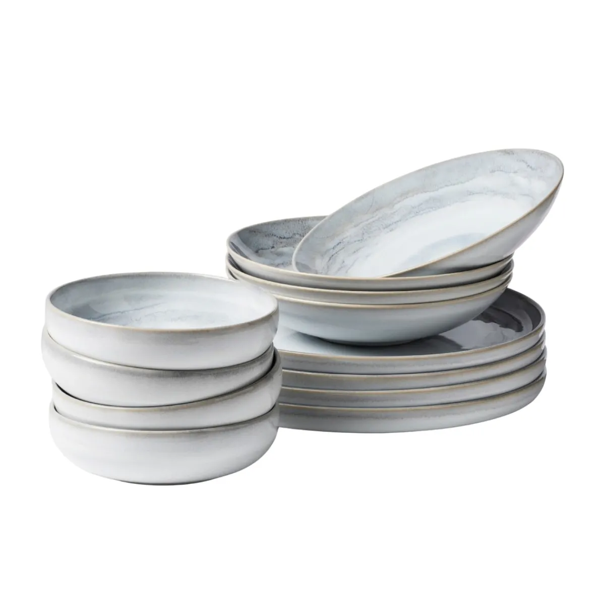 Die Kollektion Tiefer See ist erhältlich in zwei verschiedenen Farbstellungen: Die Farbvariante Blau-Grün spiegelt die mystische Färbung des tiefen Sees wider. Die zweite Farbvariante Grau-Weiß ist inspiriert vom nebelverhangenen Morgen am See, wenn Wasser und Himmel in sanften Tönen miteinander verschmelzen und eine friedliche Ruhe den See umhüllt.