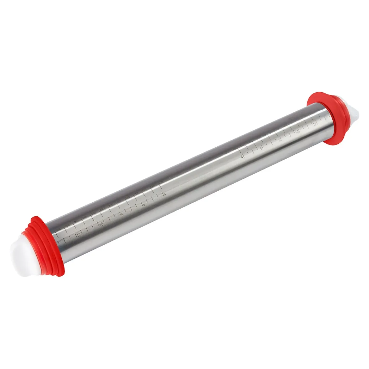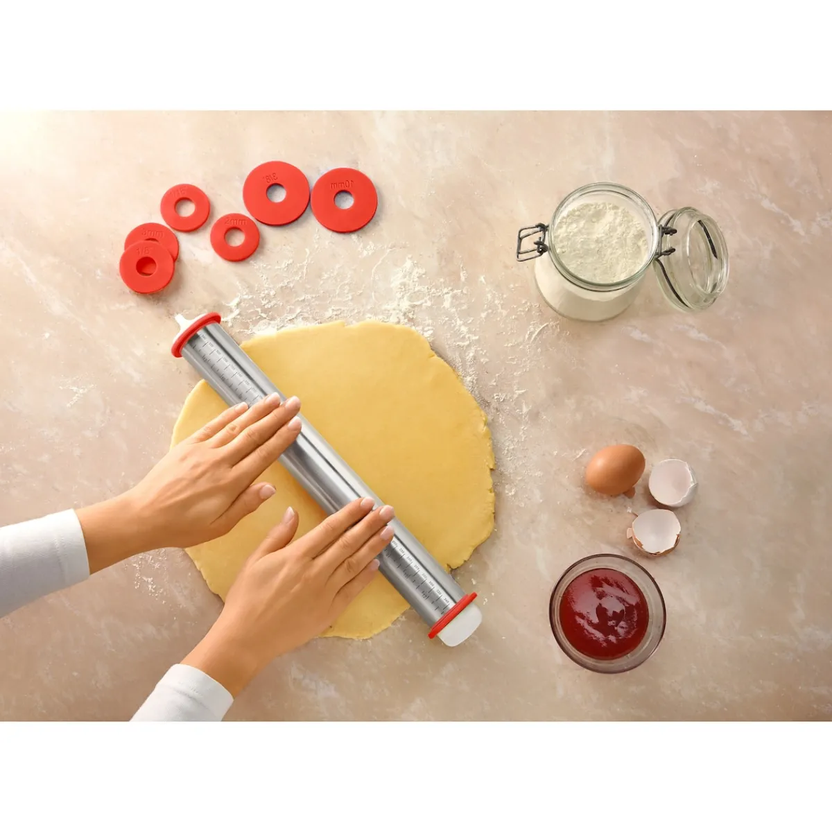 Backen wie die Profis: Mit der Teigrolle aus Edelstahl können Sie exakt die Dicke von Pizza-, Nudel- oder Kuchenteig bestimmen. Einfach seitlich die Halterung abschrauben und die Abstandaufsätze auf 2 mm, 3 mm, 6 mm oder 10 mm einstellen, schon kann es losgehen. Spülmaschinengeeignet. Hitzebeständig bis +100 °C.
