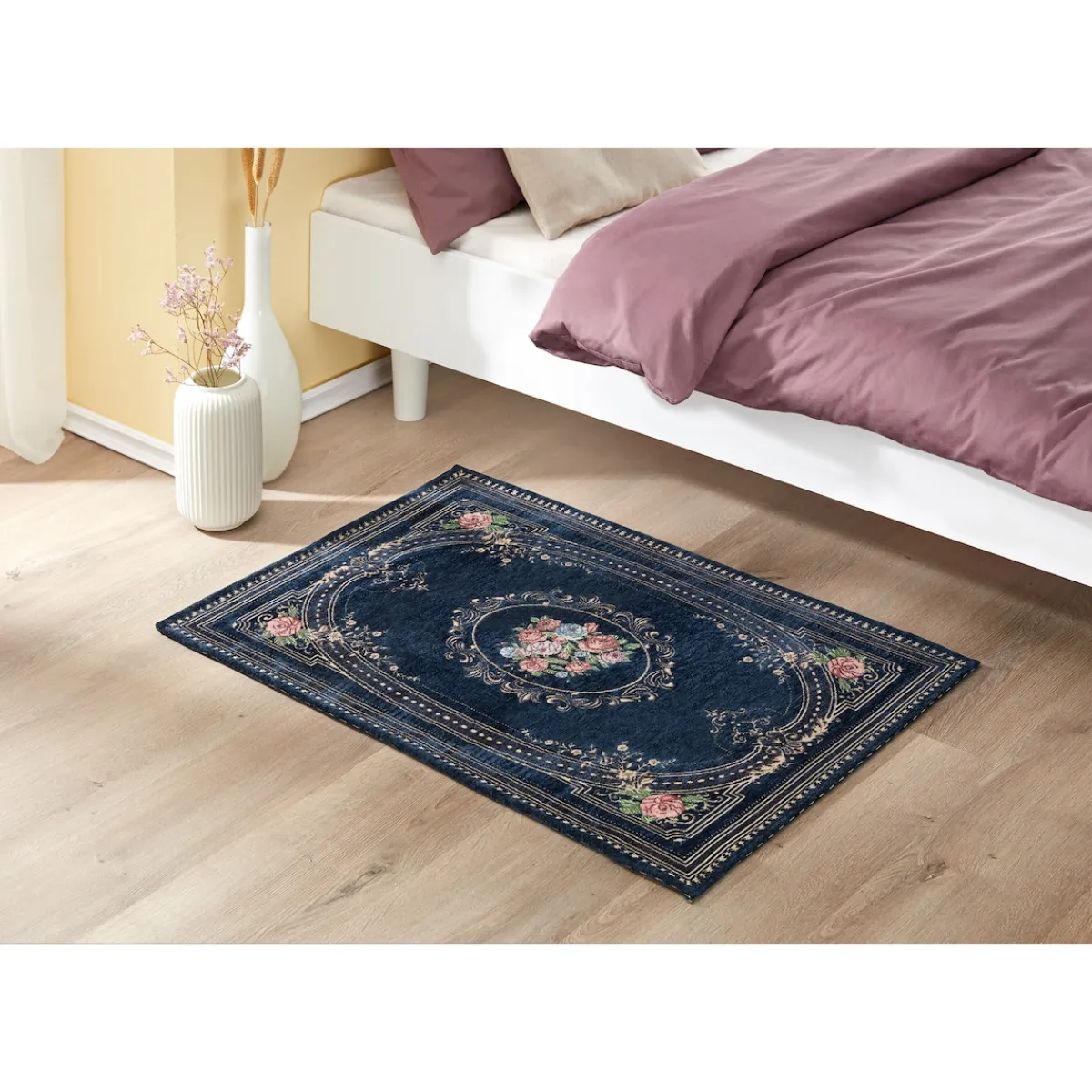 Erleben Sie eine tägliche Dosis Romantik mit unserem Blumenteppich. Die kunstvoll gestalteten klassischen Blumen, die auf einem edlen, dunklen Untergrund blühen, schaffen eine bezaubernde Atmosphäre in Ihrem Zuhause. Genießen Sie die zeitlose Eleganz des Designs, das jeden Raum aufwertet.
