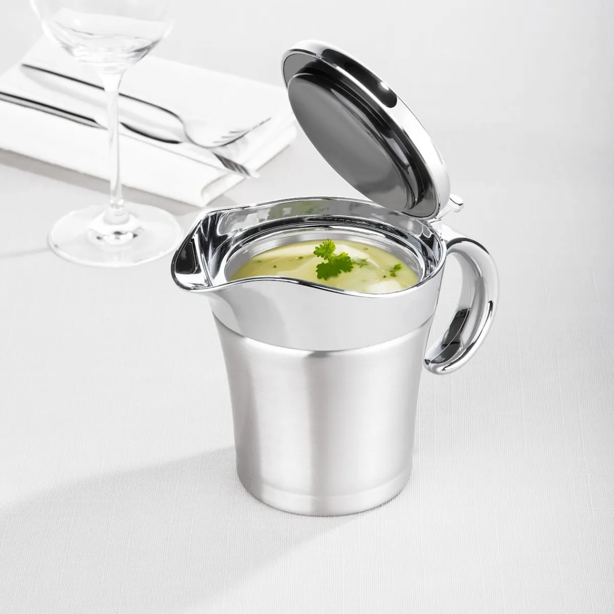 Erst die Soße macht Gerichte zur Köstlichkeit! Damit diese auch warm bleibt, geben Sie sie einfach in die doppelwandige Sauciere. Durch die Thermofunktion ist sie auch zum Kalthalten geeignet. Mit Deckel aus verchromtem Kunststoff und komfortablem Griff.