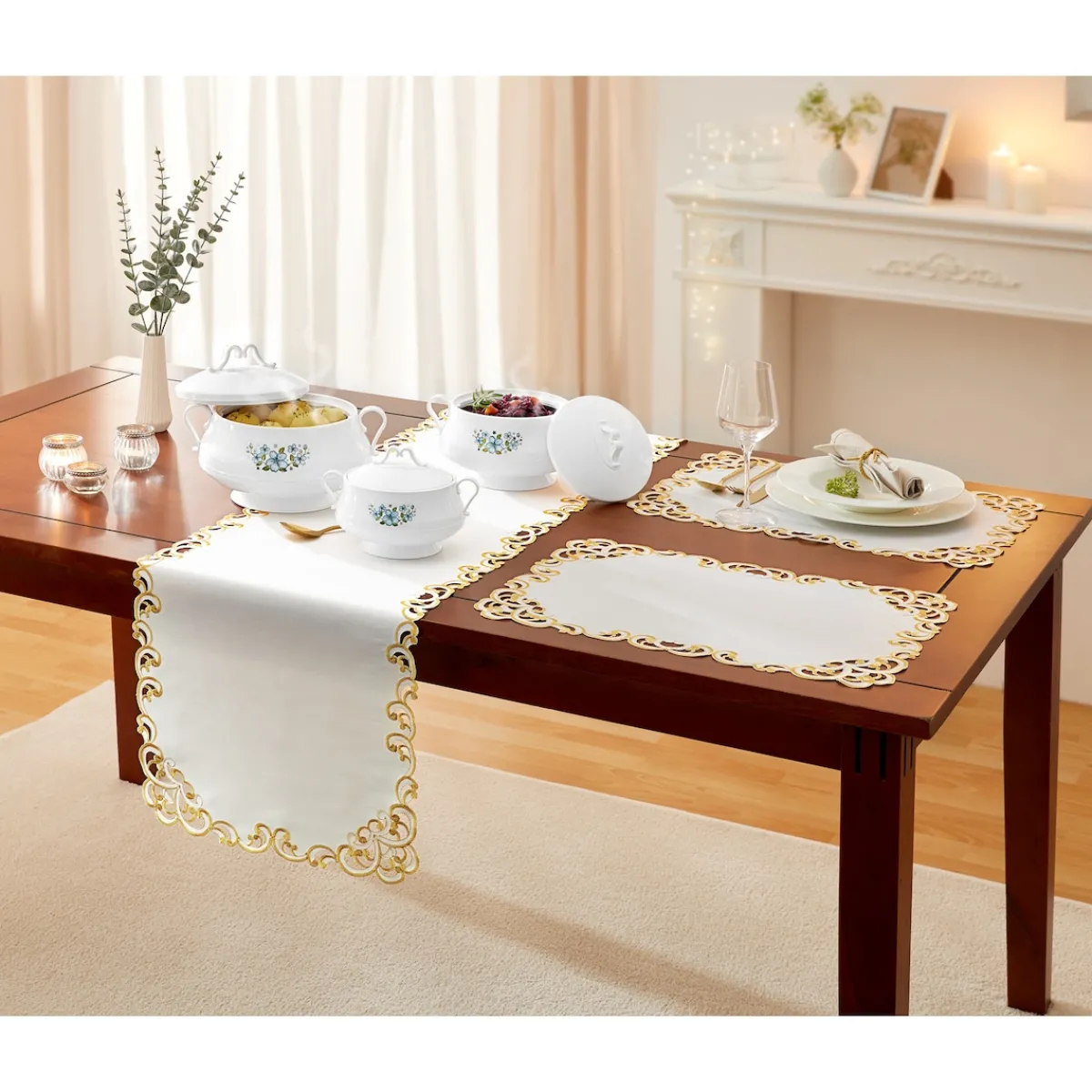 Tischlein deck dich – aber bitte festlich! Da kommt dieser elegante Tischläufer gerade recht. In klassischem Weiß, mit edlen Durchbrüchen, ist er die ideale „Grundlage“ für kreativ und liebevoll eingedeckte Tische.