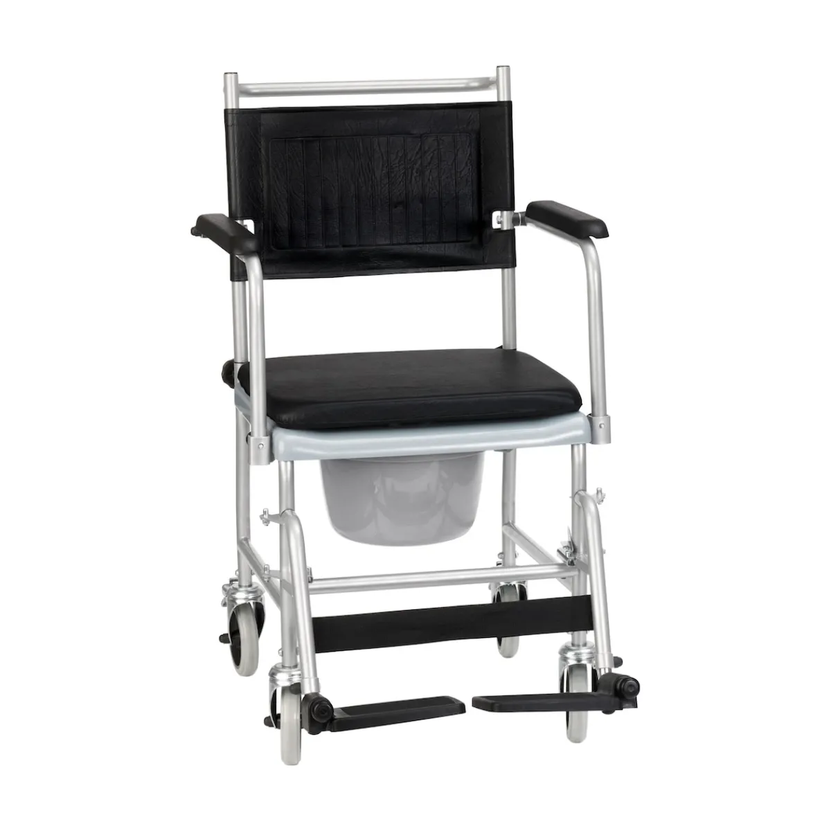 Rollstuhl und Toilettenstuhl in Einem. Bequem fahrbar auf 4 Lenkrollen, die beiden hinteren mit Feststellbremse. Abnehmbares Sitzpolster, Sitzbrille, Öffnung 26 x 23 cm. Entnehmbarer 5 Liter-Eimer mit Deckel und Bügel. Aus pulverbeschichtetem Stahlrohr, Eimer, Sitzbrille und Fußstützen aus Kunststoff, Armlehnen aus Polyurethan. Belastbar bis 120 kg. Einfache Montage ohne Werkzeug.