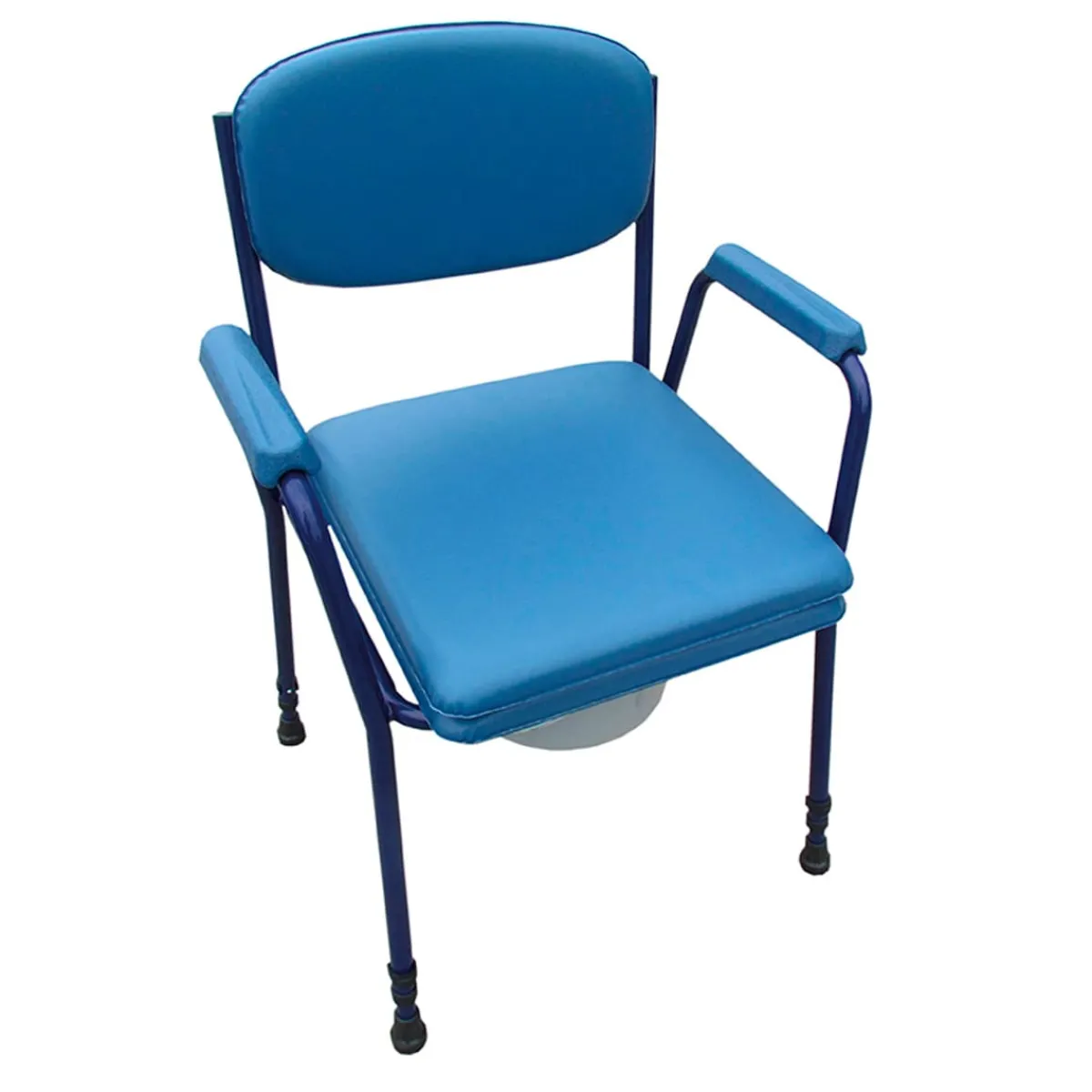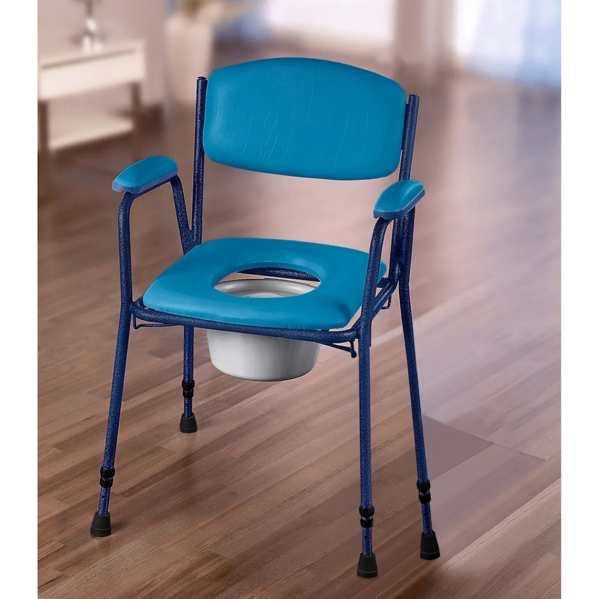 Stabiler Toilettenstuhl mit korrosionsbeständigem Rahmen aus Aluminium. Gepolsterte Flächen mit pflegeleichtem PVC-Bezug. Höhenverstellbar.