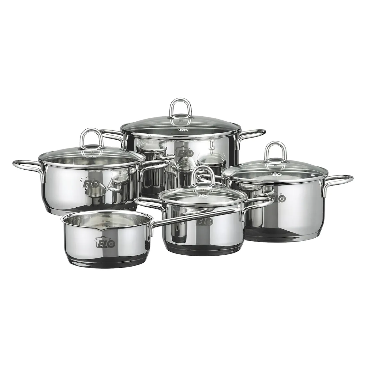 1 x Bratentopf mit Glasdeckel,1 x Fleischtopf Ø 16 cm mit Glasdeckel, 1 x Fleischtopf Ø 20 cm mit Glasdeckel, 1 x Gemüsetopf mit Glasdeckel, 1 x Stielkasserolle ohne Deckel.