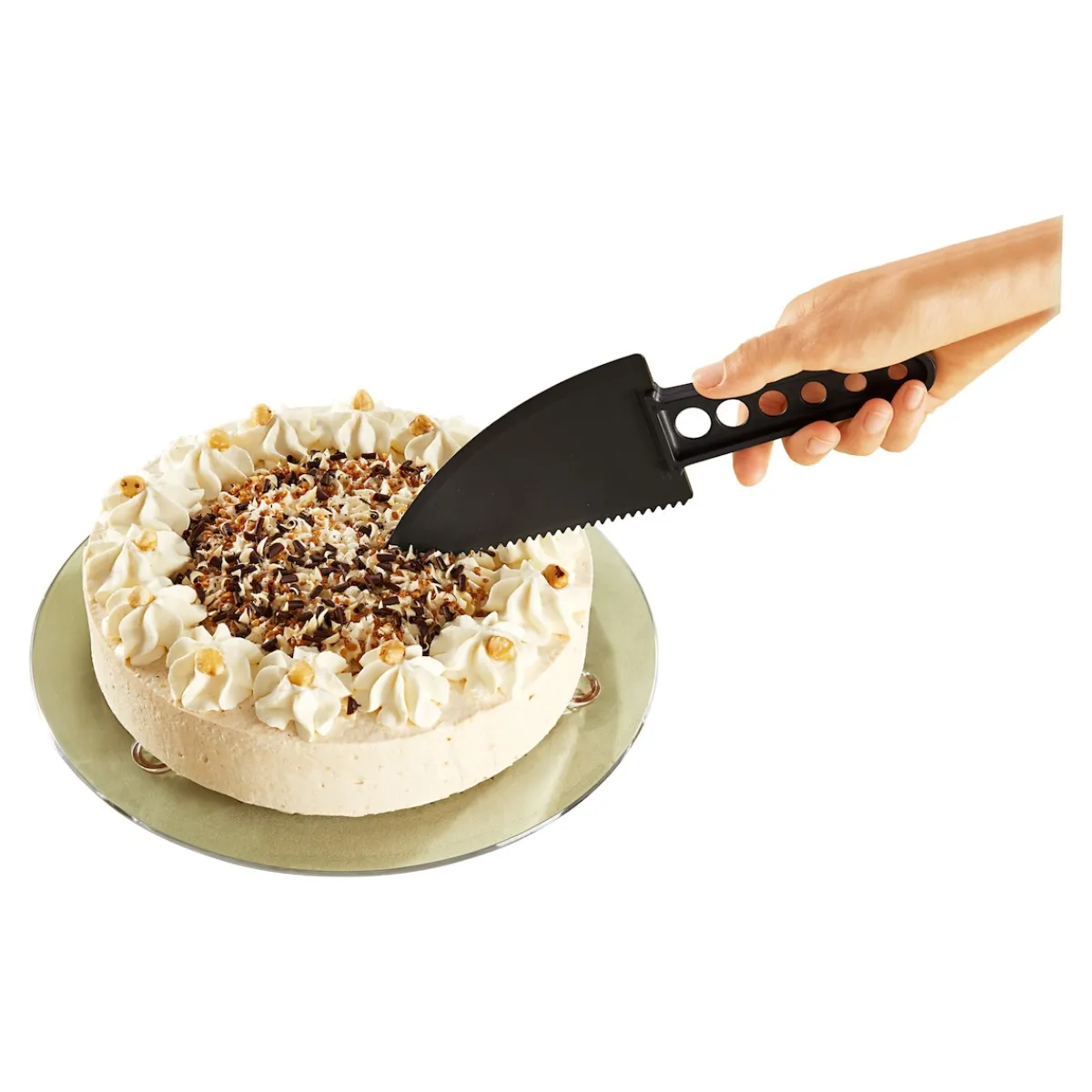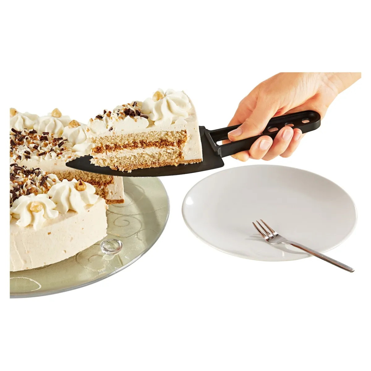 Doppelt nützlich: Der Tortenheber ist gleichzeitig ein Trennmesser, mit dem Sie Ihren Kuchen einfach und sauber teilen können, ohne Kratzer auf der Kuchenplatte zu hinterlassen.