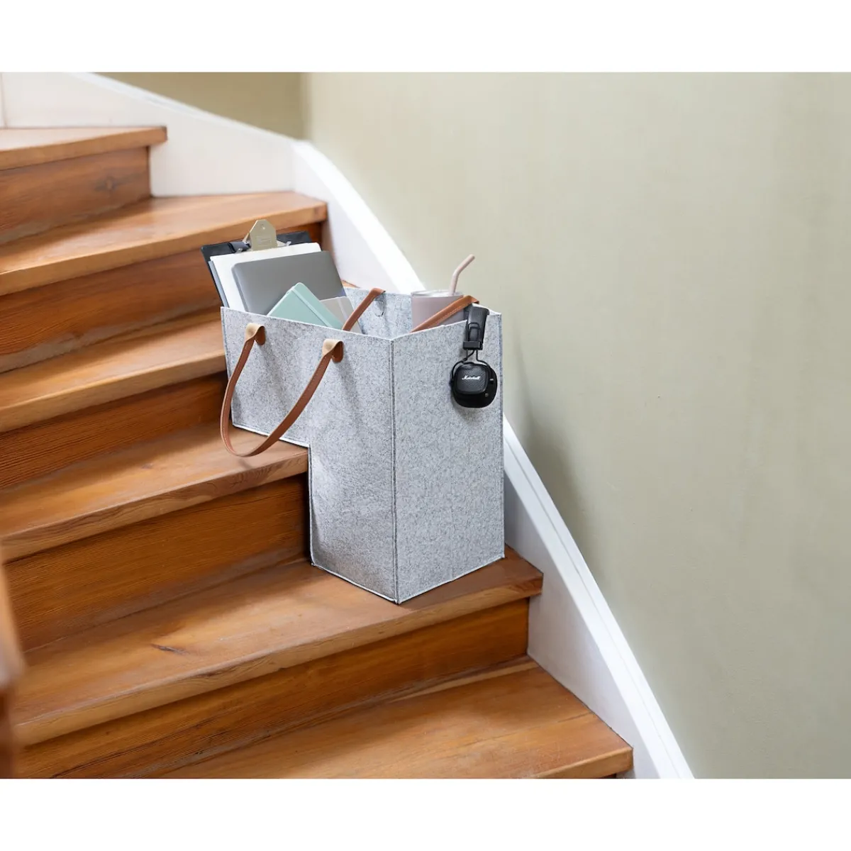 Passgenau und standsicher auf der Stufe platziert, nutzt dieser Spezialkorb wertvolle Staufläche an Treppen und sorgt für Ordnung. Geduldig sammelt er Ihre Alltagsgegenstände, die bei der nächsten Gelegenheit einen Stock höher transportiert werden wollen.