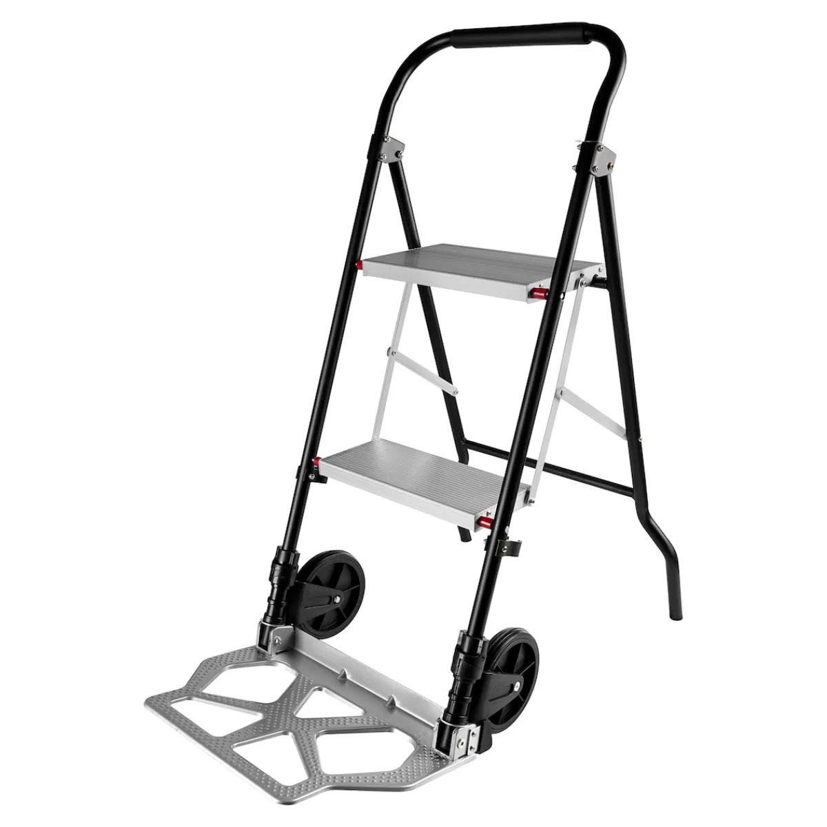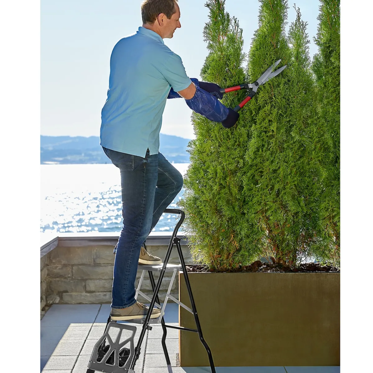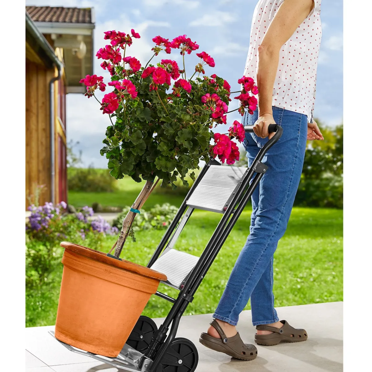 Dieser Tritt-Lastentrolley begeistert gleich mit 2 Funktionen: Ausgeklappt dient er als stabile Trittleiter, z. B. für Garten- und Haushaltsarbeiten. Zusammengeklappt hilft er Ihnen als Lastentrolley beim Transport von Gertränkekisten, Paketen oder sehr klobigen Blumentöpfen. Bei Nichtgebrauch lässt er sich platzsparend verstauen.
