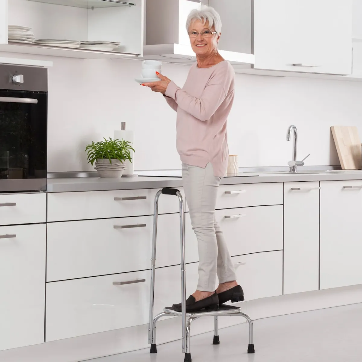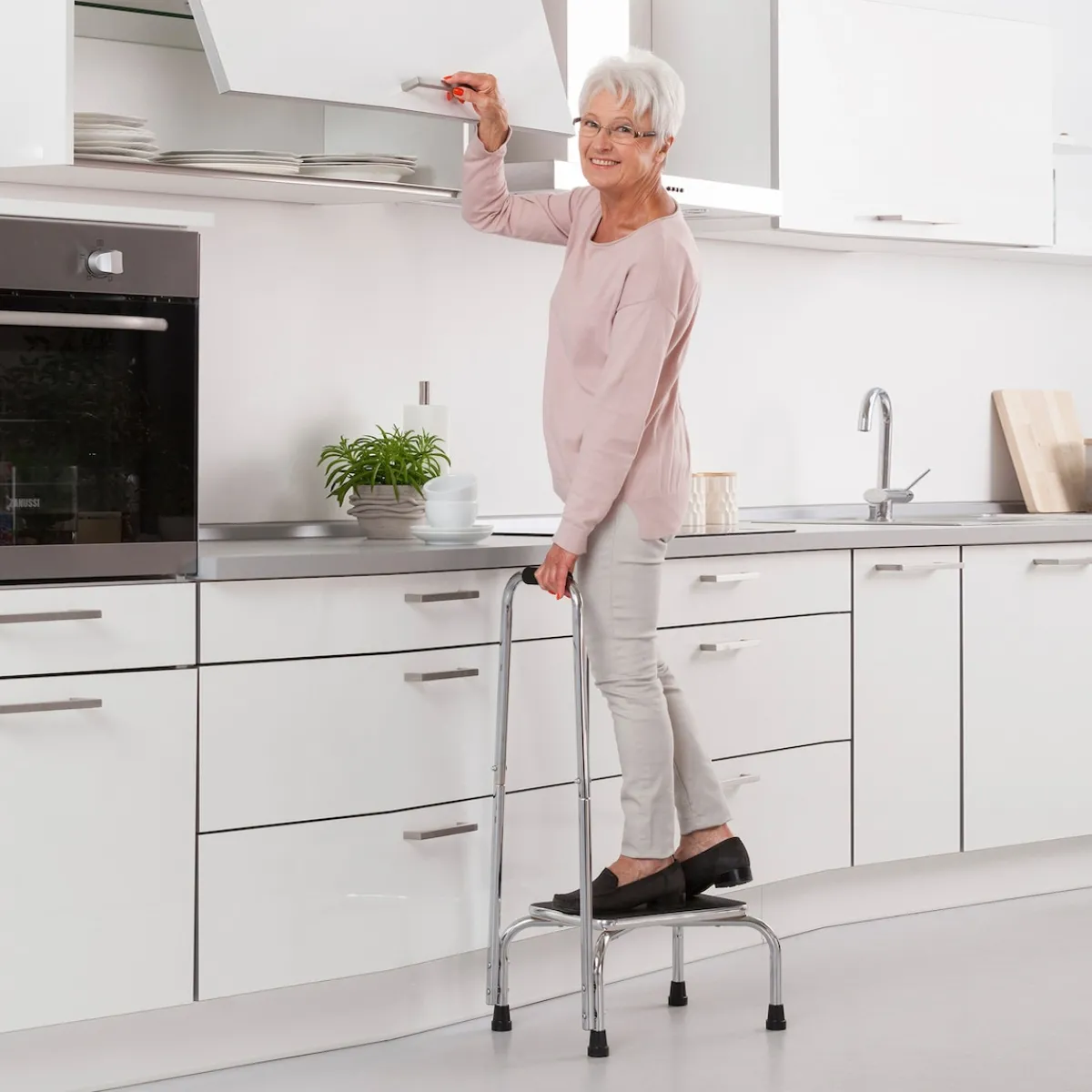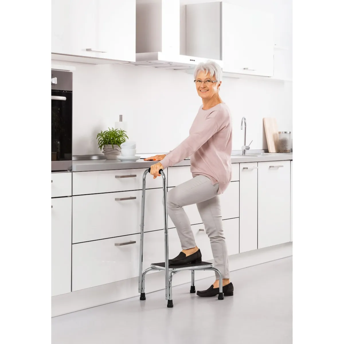 Der Bügel gibt Ihnen beim Hochsteigen Sicherheit und ist in Griffweite, wenn Sie Halt suchen. Rutschhemmende Trittfläche und Standfüße aus Gummi.