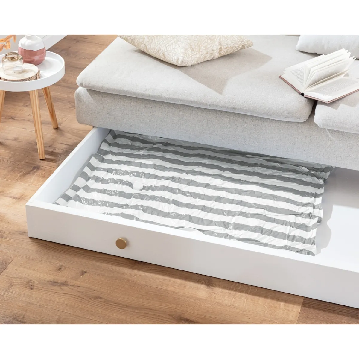 Stellen Sie sich vor: Sie packen Ihre Winterjacken, Decken oder Kissen in diesen Beutel, saugen die Luft mit Ihrem Staubsauger heraus und voilà – plötzlich sind sie so platzsparend, dass Sie jede Menge Platz in Ihrem Kleiderschrank oder unter dem Bett haben. Und nicht nur das: Die robusten Beutel schützen Ihre liebsten Textilien vor Feuchtigkeit, Staub und Ungeziefer.