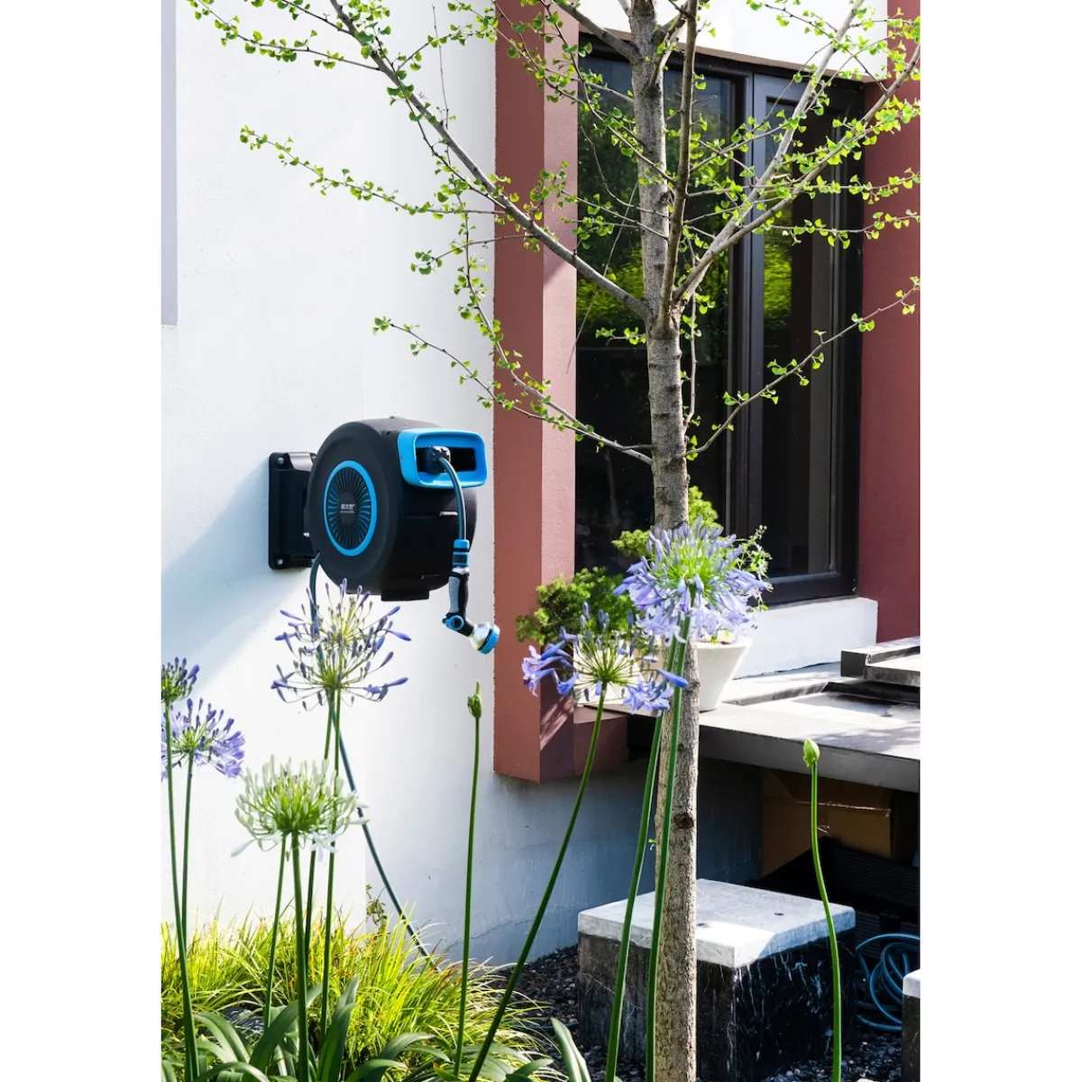 Diese Box hat Ihren Gartenschlauch fest im Griff: Sagen Sie „tschüss“ zu Bücken, abknickenden Schläuchen, dreckigen Händen und lästigen Stolperfallen. Dank der kurzen Arretierstopps lässt sich der Schlauch ganz einfach auf die gewünschte Länge ausfahren – der Einzug erfolgt automatisch und in gleichmäßiger Geschwindigkeit. Box um 180°schwenkbar. Inkl. Handbrause und Wandhalterung.