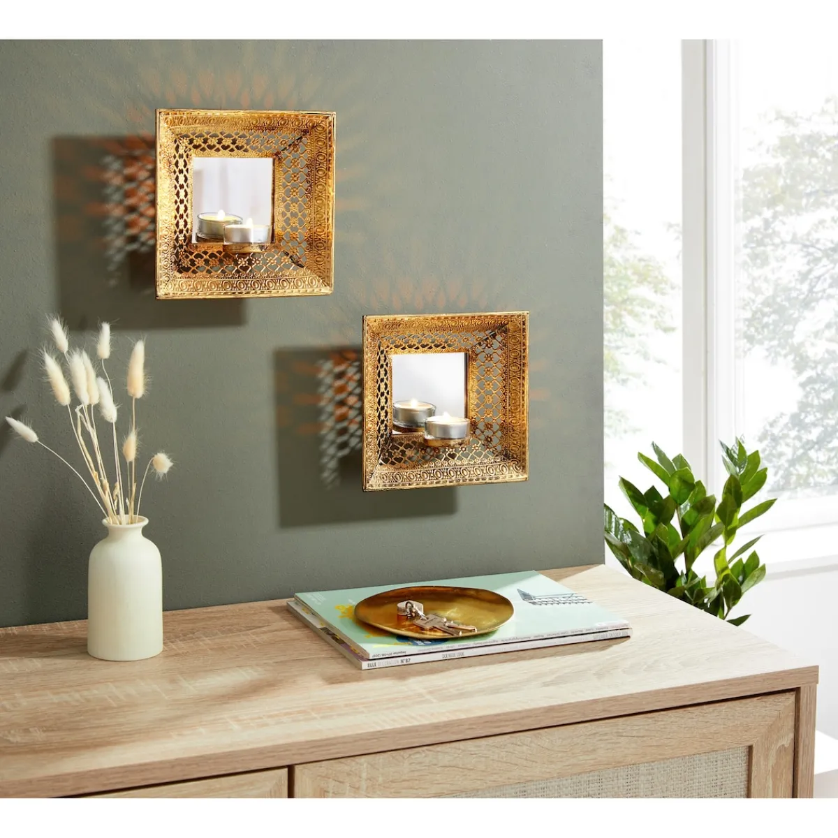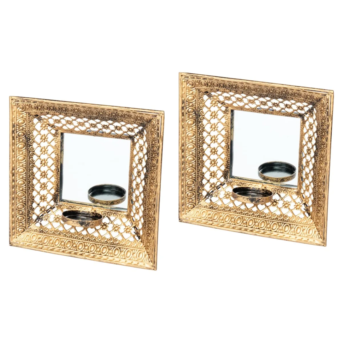 Wer sind die schönsten Wandleuchten im ganzen Land? Natürlich diese beiden majestätischen Exemplare! Mit integriertem Spiegel und Halter für Teelichter zieht das doppelte Leuchten alle Blicke magisch an. Das gestanzte Muster im Rahmen wirft ein märchenhaftes Schattenspiel an die Wand.