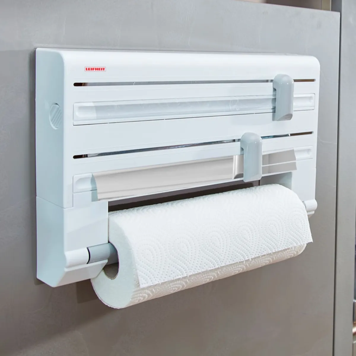 Der Wandrollenhalter Parat trennt mit seinen messerscharfen Spezialklingen Alu- und Klarsichtfolien sauber und präzise ab. Ohne zeitraubendes Kramen in Schubladen, ohne schiefe, zerrupfte Abrisskante und ohne Gefummel an der Klarsichtfolie, weil der Anfang nicht zu finden ist. Nach dem Schneiden ragen die Folien-Enden weit genug aus dem Rollenhalter heraus, um sie beim nächsten Mal mühelos greifen und herausziehen zu können. Die messerscharfen Klingen sind verletzungssicher hinter den ergonomisch geformten Schneidschiebern verborgen. Der Wandrollenhalter Parat bietet Platz für Alu- und Klarsichtfolie. Eine dritte Halterung ist für Küchenpapier vorgesehen. Nach der einfachen Wandmontage lässt sich der Wandrollenhalter schnell und bequem von vorn bestücken. Einfach Gehäuse abnehmen, Rollen rein und schon ist der Leifheit Wandrollenhalter Parat einsatzbereit. Geeignet ist er für alle handelsüblichen Rollenmaße.
