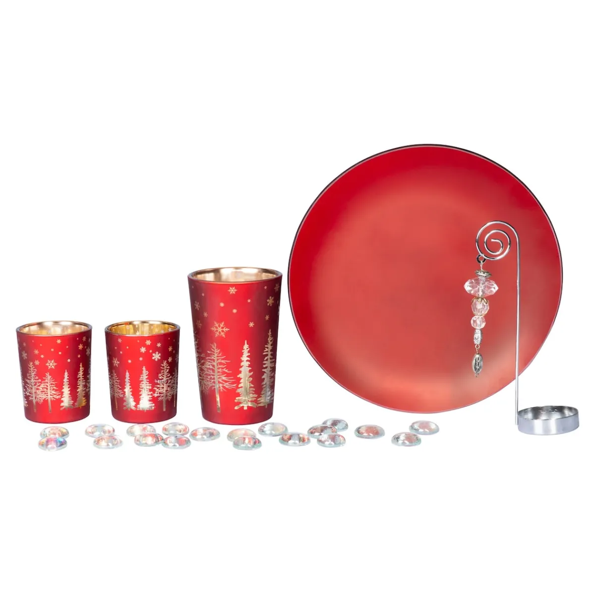 Inhalt: 1 Dekoteller, 3 Gläser, Dekosteine, Teelichthalter