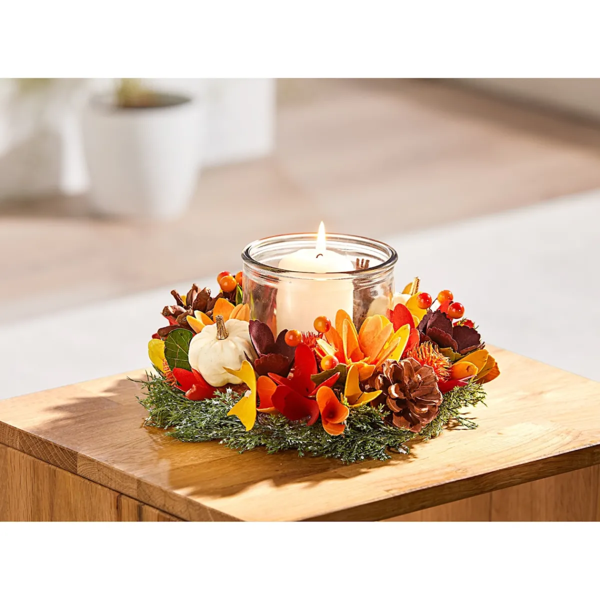 Sobald eine Flamme in diesem Windlicht tanzt, wirft sie ihren warmen Schein auf den rundum arrangierten Kranz und bringt dessen Herbstfarben zum Strahlen.