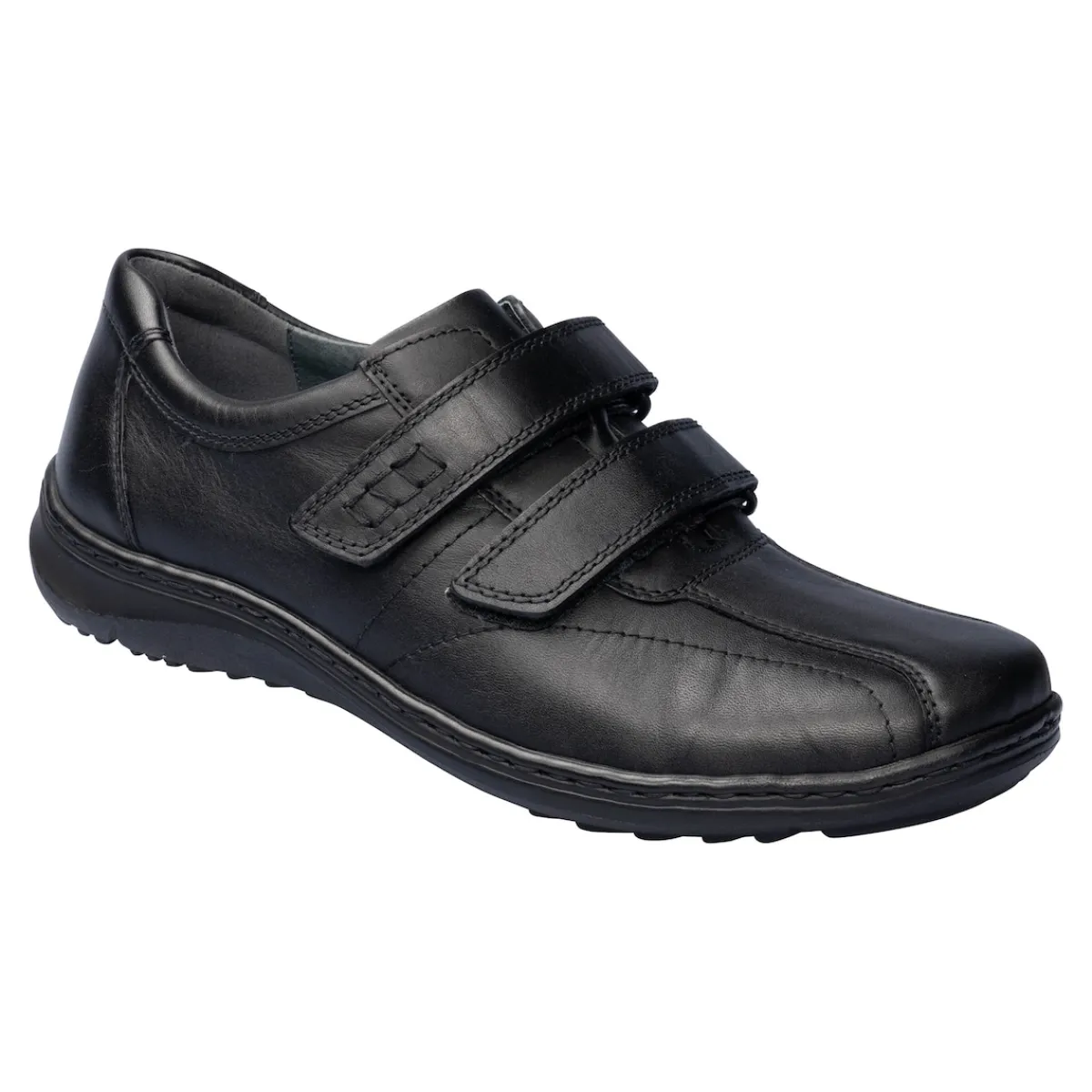 Herren Sportschuh Herwig, in eleganter Schwarz-Klettversion, ist der perfekte Begleiter für Ihren Alltag. Das hochwertige Nappa-Oberleder und das angenehm weiche Innenleder bieten höchsten Komfort. Die Weite H passt sich optimal auch an stärkere Füße an, während das luftgepolsterte Wechselfußbett Gelenke und Bandscheiben schont. Die praktischen Klettverschlüsse ermöglichen ein einfaches An- und Ausziehen ohne Bücken.
