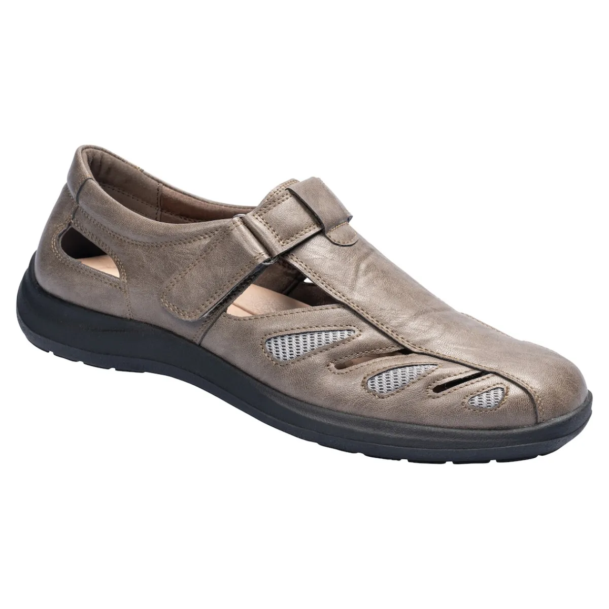 Luftig und locker gehen Sie mit dieser Herrensandale in schicker Leder-Optik durch die warme Jahreszeit. Der praktische Klettverschluss garantiert einen sicheren Halt und ermöglicht Ihnen einen leichten Ein- und Ausstieg. Die weiche, herausnehmbare Einlegesohle und die Laufsohle sorgen für ein angenehmes Trage- und Gehgefühl.