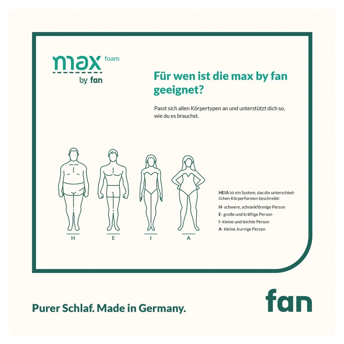Wer morgens mit Rückenschmerzen aufwacht oder nachts ständig die Schlafposition wechseln muss, weiß: Eine gute Matratze macht den Unterschied. Die max foam Matratze passt sich flexibel an – ganz gleich, ob Sie auf dem Rücken, der Seite oder dem Bauch schlafen. Der punktelastische Hybridschaum sorgt für angenehme Druckentlastung, die viscoelastische Schicht für spürbare Anpassung – auch bei mehr Gewicht. Im Inneren stützt ein 5-Zonen-Kern gezielt dort, wo Ihr Körper es braucht. Einfaches Handling, ein Umdrehen von Ober- auf Unterseite ist nicht nötig sowie praktisch im Alltag: Der Bezug ist teilbar, leicht abnehmbar und bei 60 °C waschbar – ideal für alle, die auf Hygiene achten.