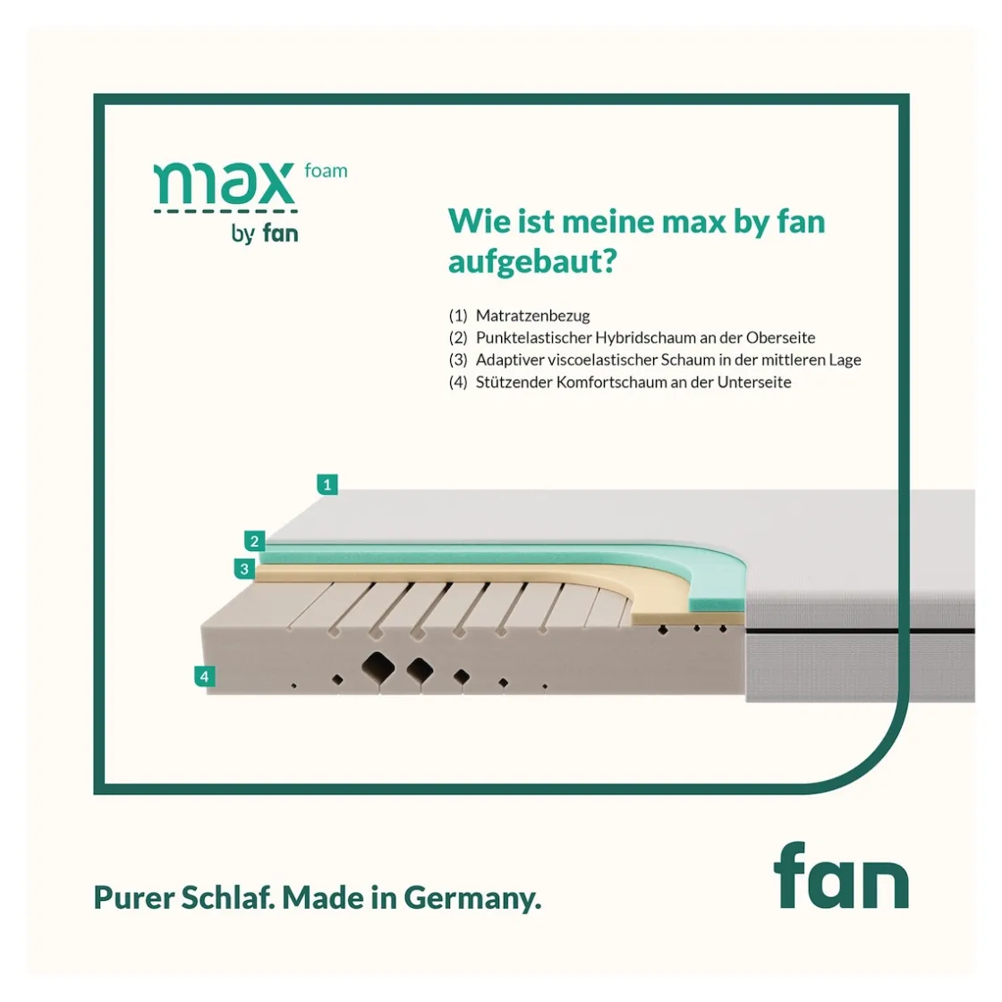 Wer morgens mit Rückenschmerzen aufwacht oder nachts ständig die Schlafposition wechseln muss, weiß: Eine gute Matratze macht den Unterschied. Die max foam Matratze passt sich flexibel an – ganz gleich, ob Sie auf dem Rücken, der Seite oder dem Bauch schlafen. Der punktelastische Hybridschaum sorgt für angenehme Druckentlastung, die viscoelastische Schicht für spürbare Anpassung – auch bei mehr Gewicht. Im Inneren stützt ein 5-Zonen-Kern gezielt dort, wo Ihr Körper es braucht. Einfaches Handling, ein Umdrehen von Ober- auf Unterseite ist nicht nötig sowie praktisch im Alltag: Der Bezug ist teilbar, leicht abnehmbar und bei 60 °C waschbar – ideal für alle, die auf Hygiene achten.