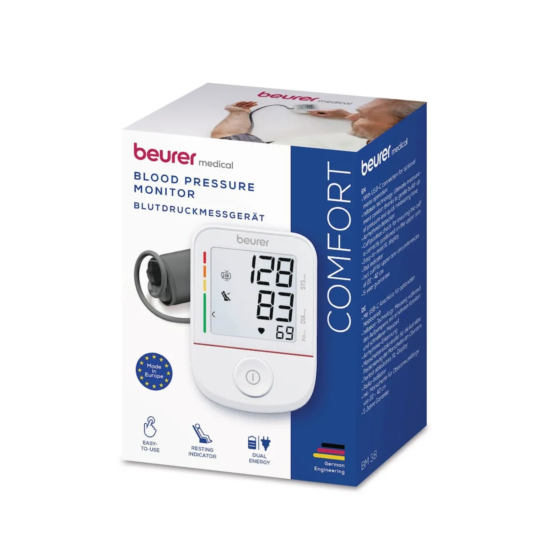 Das Blutdruckmessgerät ermöglicht eine schnelle und präzise Blutdruckmessung am Oberarm – ganz bequem per Knopfdruck. Das große Display sorgt dafür, dass Sie Ihre Messwerte klar und mühelos ablesen können. Während der Messung profitieren Sie von der Inflation-Technology, die den Blutdruck bereits während des Aufpumpens misst – für mehr Komfort und eine schnellere Messung. Der integrierte Ruheindikator liefert verlässliche Ergebnisse, da er Sie auf die richtige Messumgebung hinweist. Zusätzlich können Sie Ihre Messdaten digital in der App „beurer HealthManager Pro“ speichern und jederzeit nachverfolgen.
