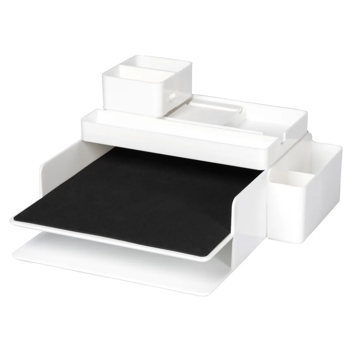 Alles, was Sie für einen aufgeräumten Schreibtisch brauchen: Dieses Orga-Set besteht aus 4 optimal aufeinander abgestimmten Teilen. Die Dokumentenablage bietet Platz für einen dicken Stapel A4-Papier. Auf der Zubehörablage können Sie dazu auch Tablet, Locher, Schere und andere größere Utensilien ablegen. Kleinteile, wie Stifte, Radiergummi oder Notizzettel, finden im Stiftehalter oder auf der Kleinteilablage ihren Platz. Die integrierten Haltevorrichtungen für Handy und Tablet machen das Set für entspanntes Arbeiten komplett!