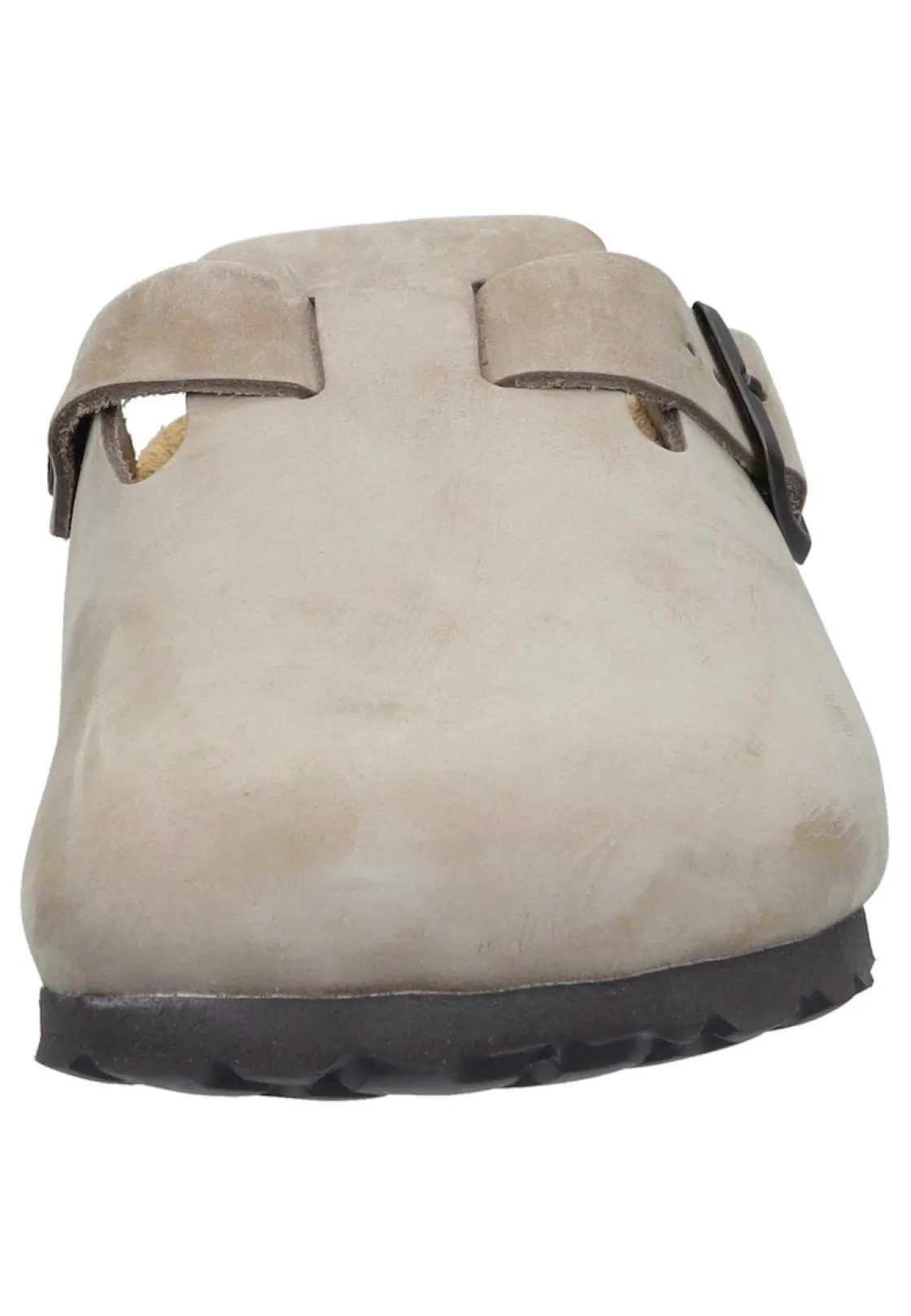Bei diesem Produkt handelt es sich um einen Schuh aus der Kategorie Clogs ohne Absatz für Herren. Als Obermaterial wurde Nubukleder verwendet und im inneren Bereich des Schuhs wurde ungefüttert und weiche Lederdecksohle, gepolstertes Naturform-Korkfußbett verarbeitet. Die Schuhweite dieses Artikels ist Weite G und somit normal. Als Verschlussart wurde Schlupfschuh gewählt und die Leichtzellsohle rundet das Produkt ab. Der Artikel fällt normal aus, bitte die gewohnte Größe bestellen. – Schuhweite: Weite G –