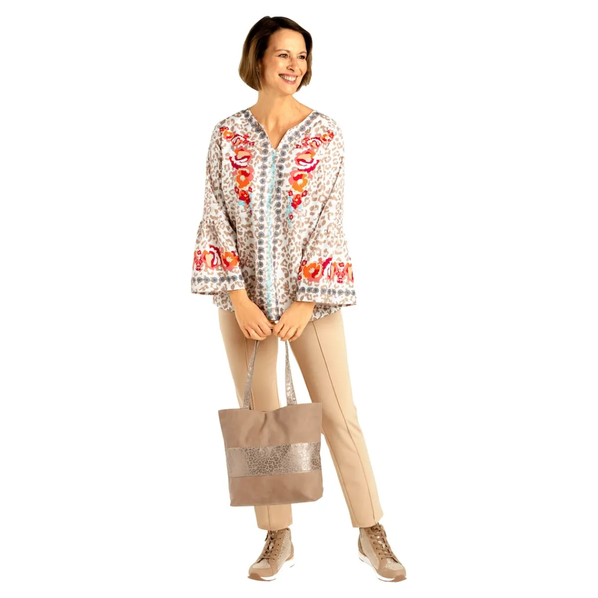 Verleihen Sie Ihrer Garderobe ein Gefühl von Leichtigkeit! Im Leoparden-Design mit den luftigen 3/4-langen Trompetenärmeln ist die Bluse sowohl elegant als als auch alltagstauglich.