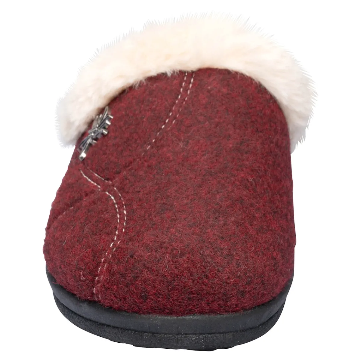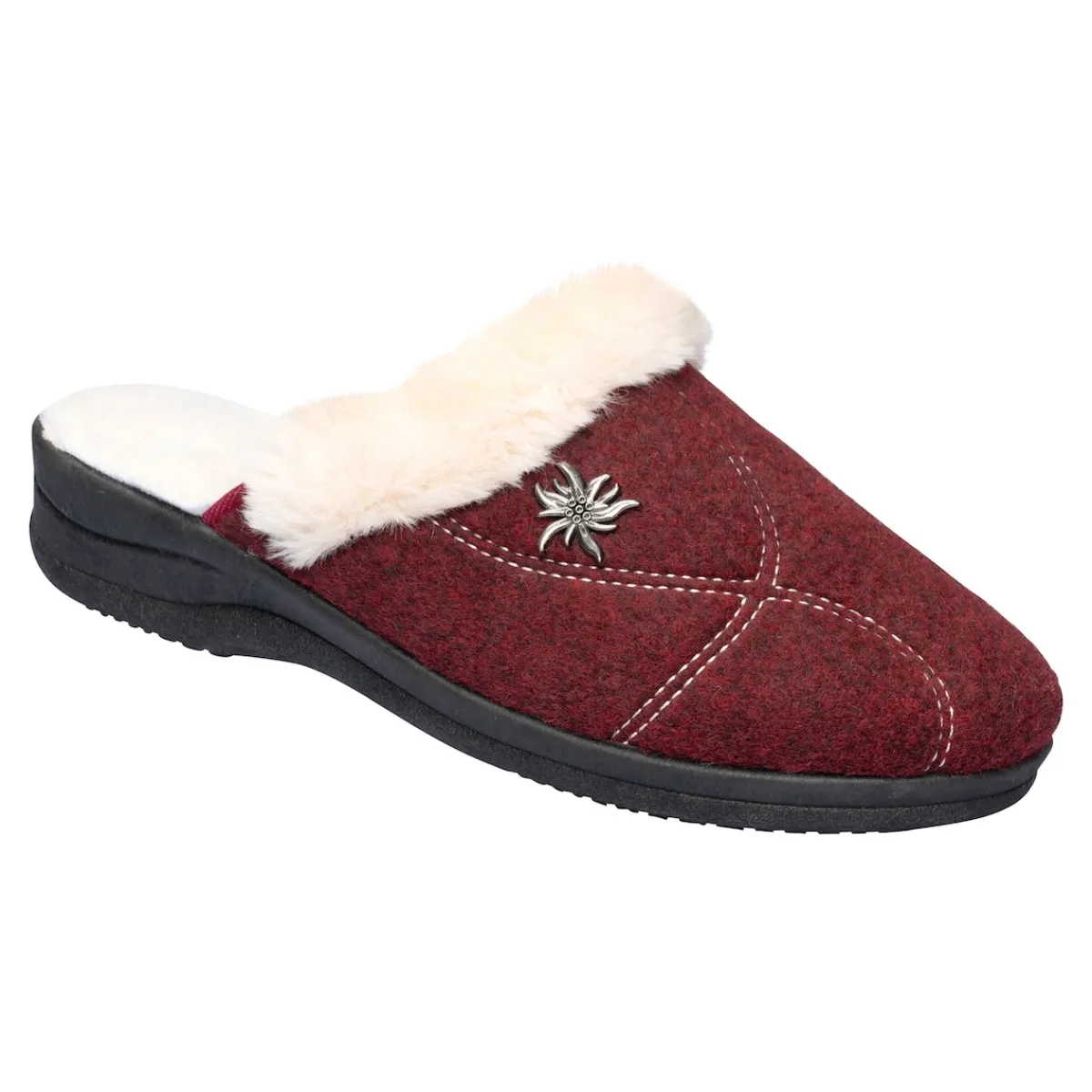 Pure Behaglichkeit für jeden Tag – ein Muss für gemütliche Stunden Zuhause. Bequemer und kuschelig, warmer Hausschuh mit Wollfutter und Kunstpelzrand, sowie einer schönen Edelweiß-Applikation. Mit rutschhemmender Laufsohle.