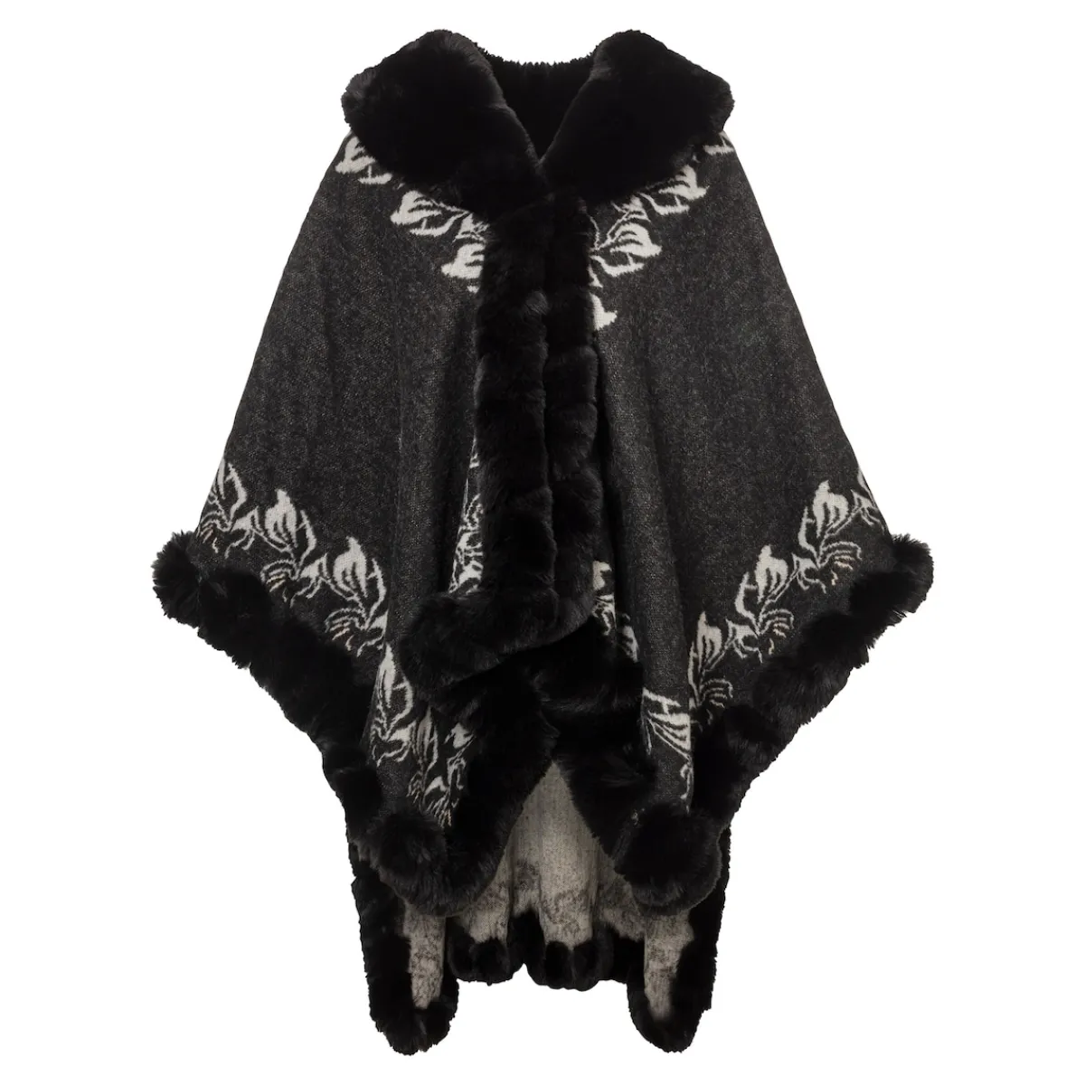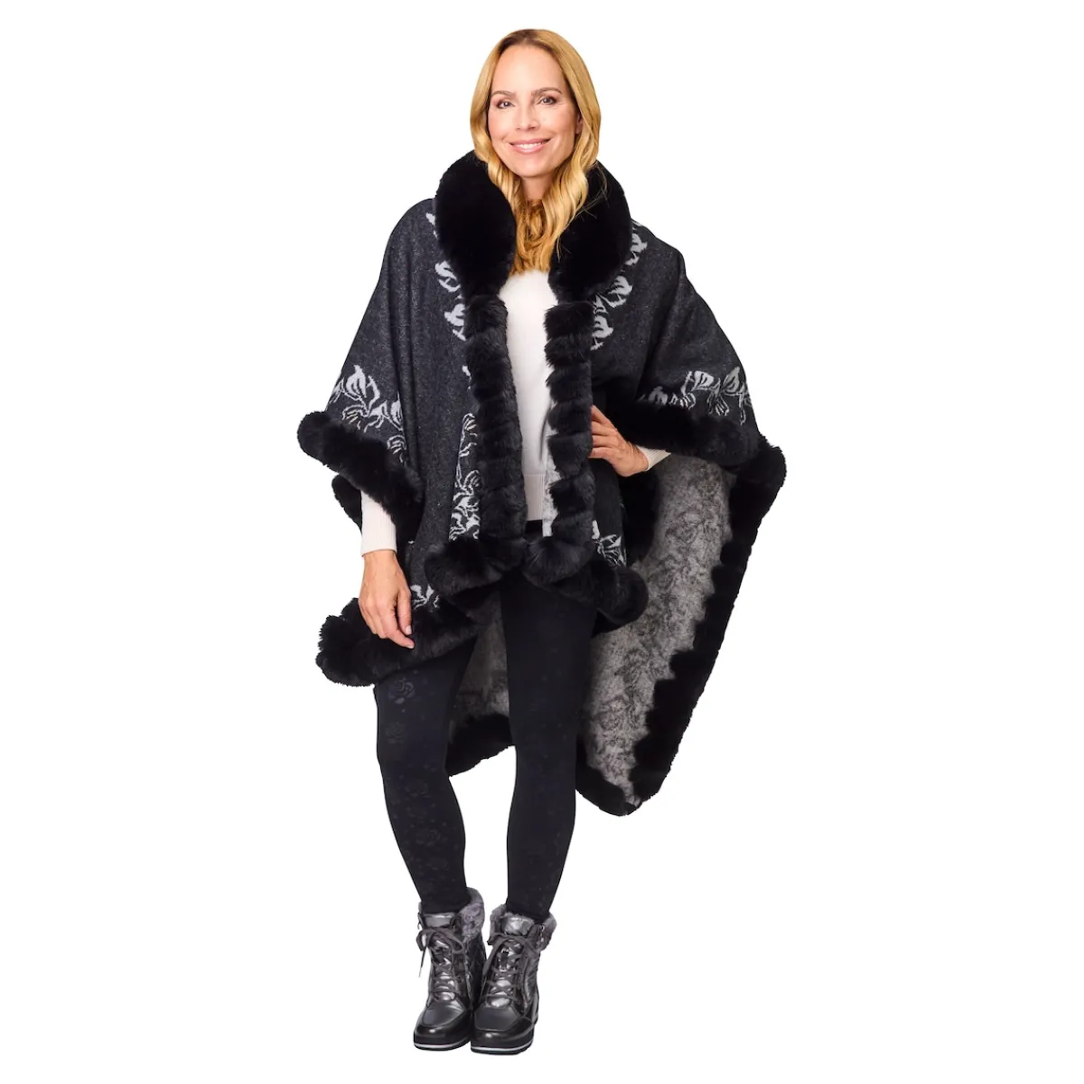 Dieser angenehm zu tragende Poncho bietet nicht nur mollige Wärme, er ist auch ein echtes Wendewunder: Einfach umdrehen und überwerfen – schon passt er perfekt zu Ihrem Outfit! Ob bei einem entspannten Spaziergang oder einem glamourösen Abendevent – der Poncho mit kuscheligem Kunstfell am Saum ist zu jedem Anlass die richtige Wahl.