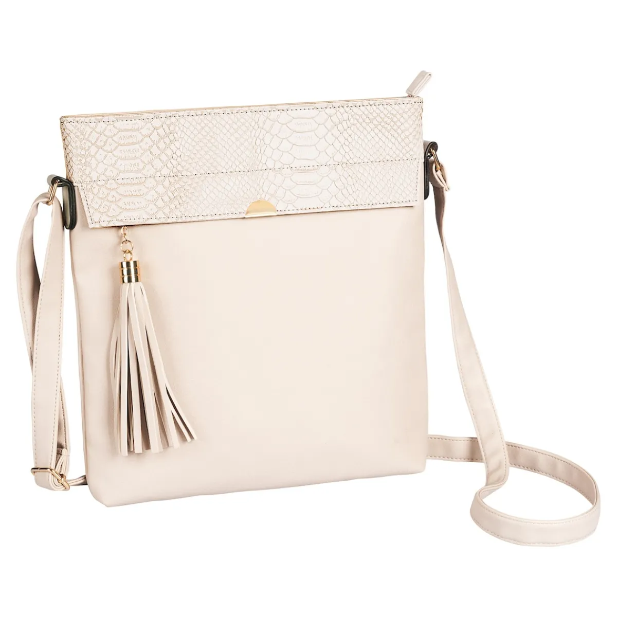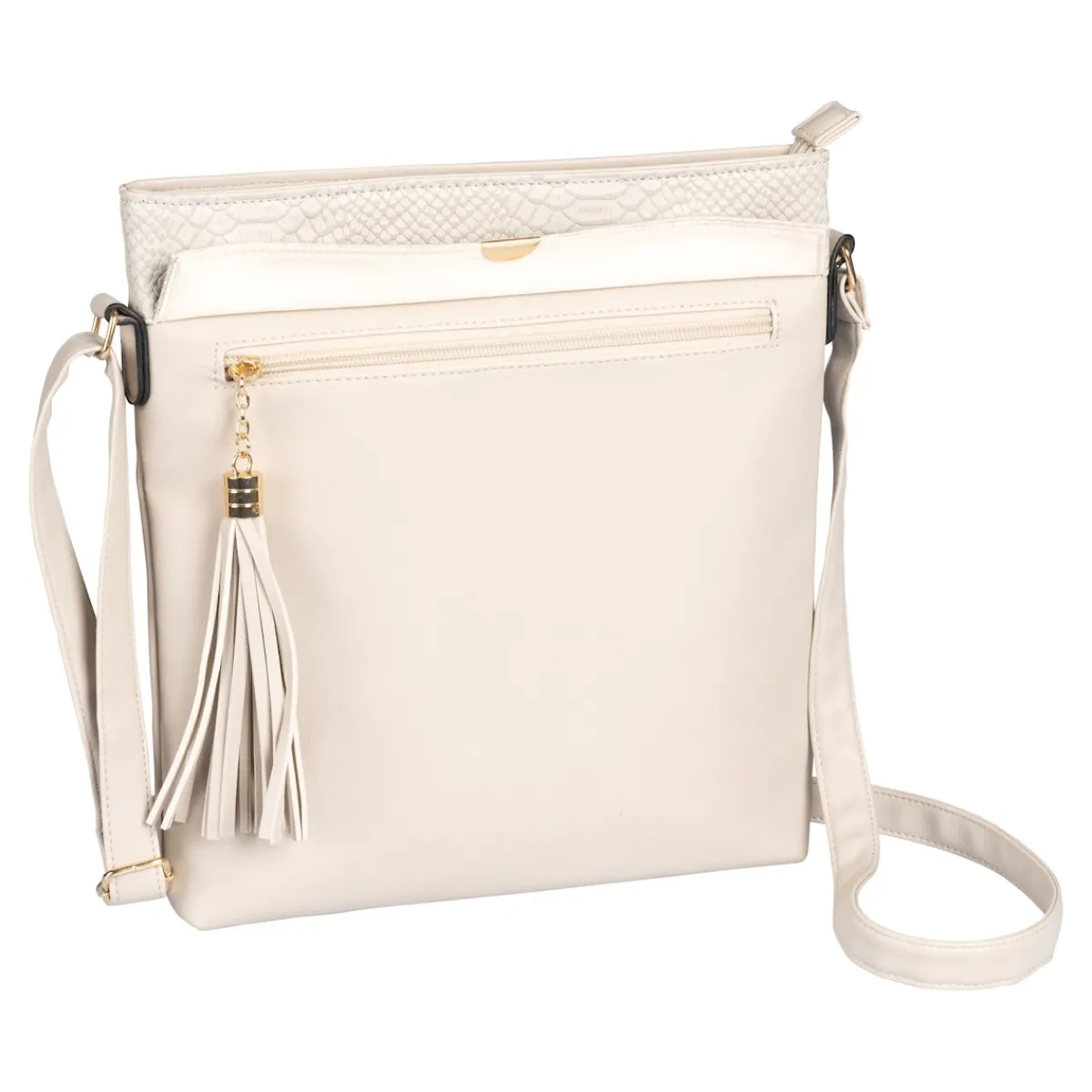 Elegant und praktisch: Diese Tasche mit dezenter Schlangenprägung und modischem Fransenanhänger besitzt gleich 3 Fächer, die mit Reißverschluss verschließbar sind. Mit verstellbarem Trageriemen.