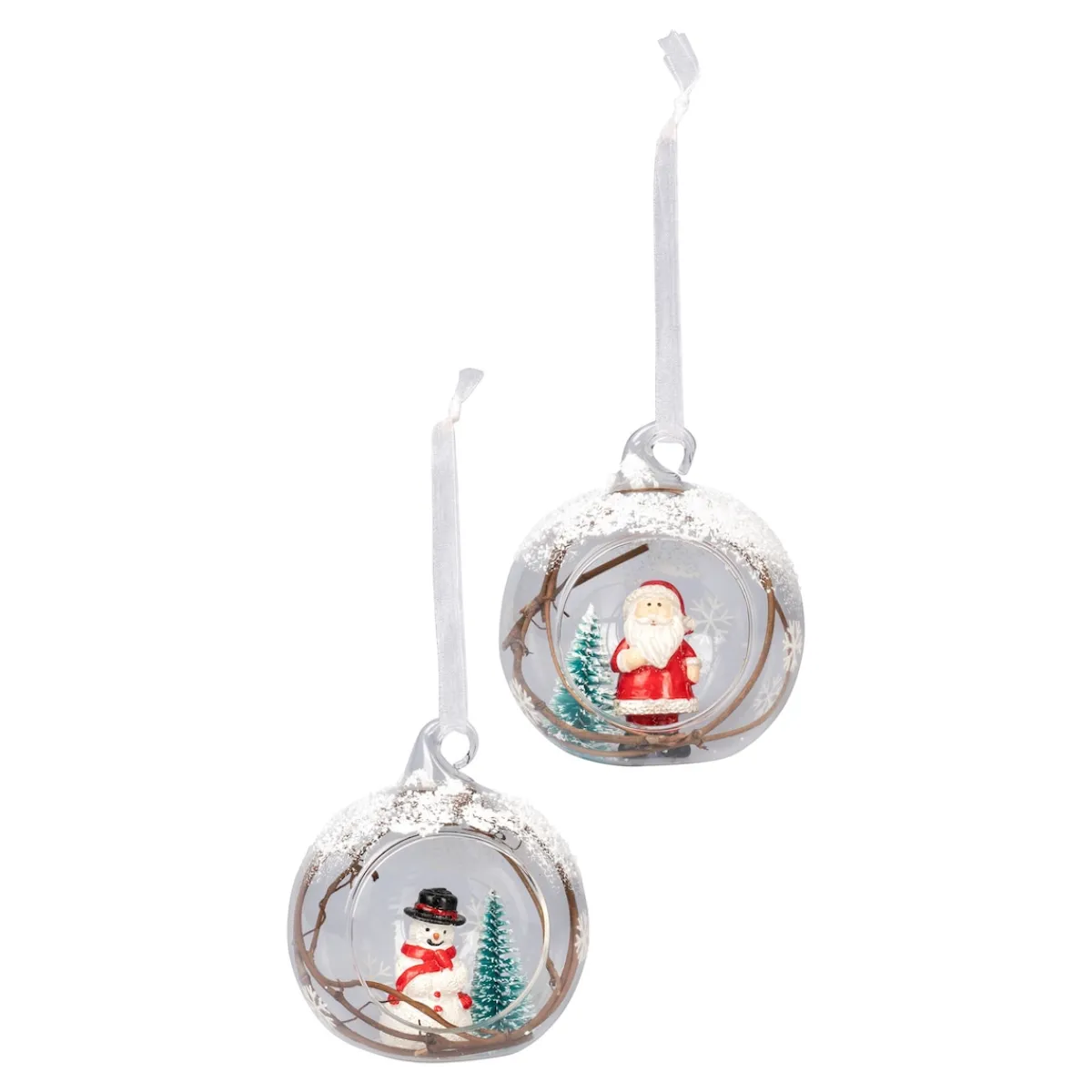 Weihnachtsschmuck in bezaubernder 3D-Optik: In diesen winterlichen Glaskugeln, liebevoll mit Kunstschnee und Zweigen verziert, wohnen Santa Claus und Schneemann „Frosti“. Beiden sieht man die Vorfreude auf das große Fest deutlich an!
