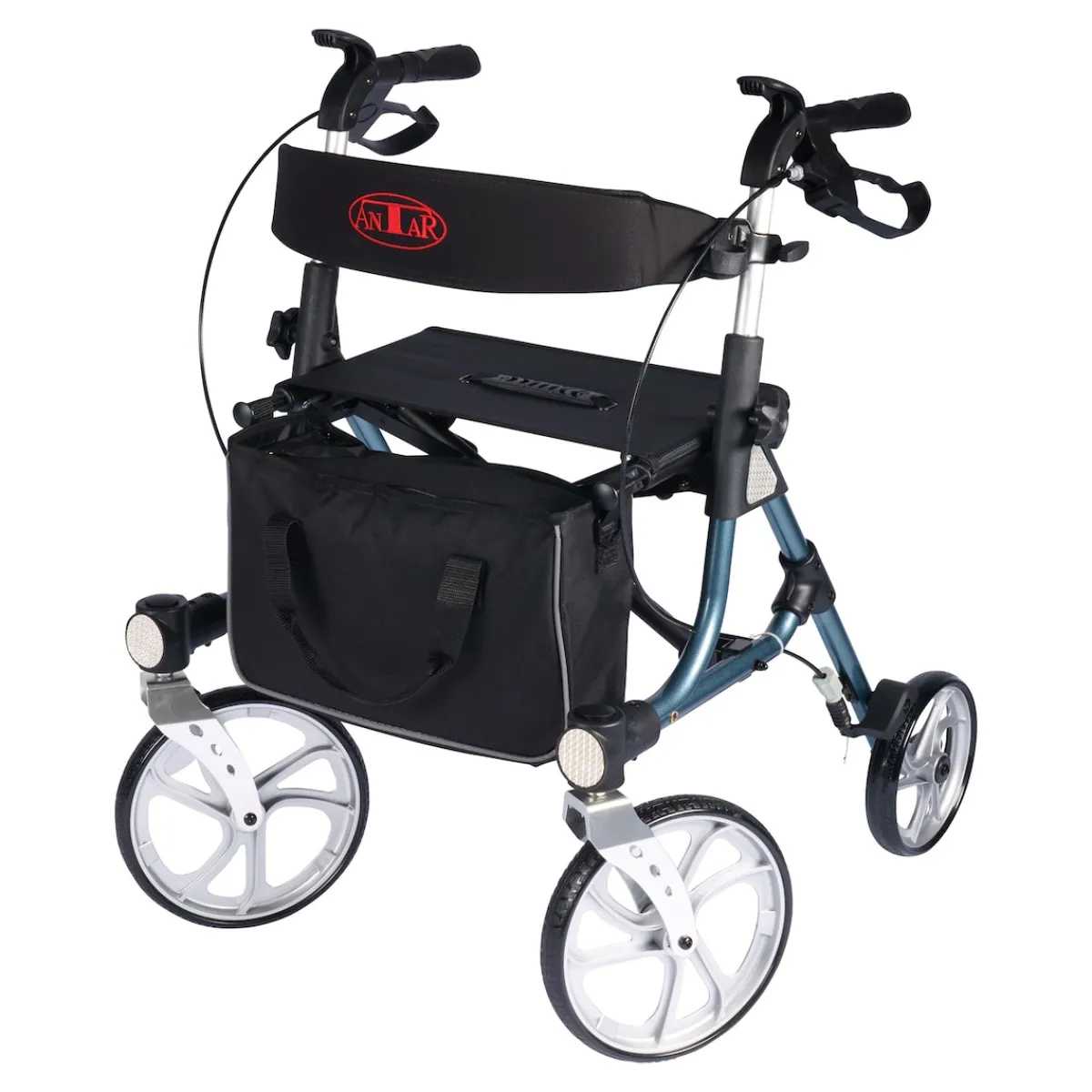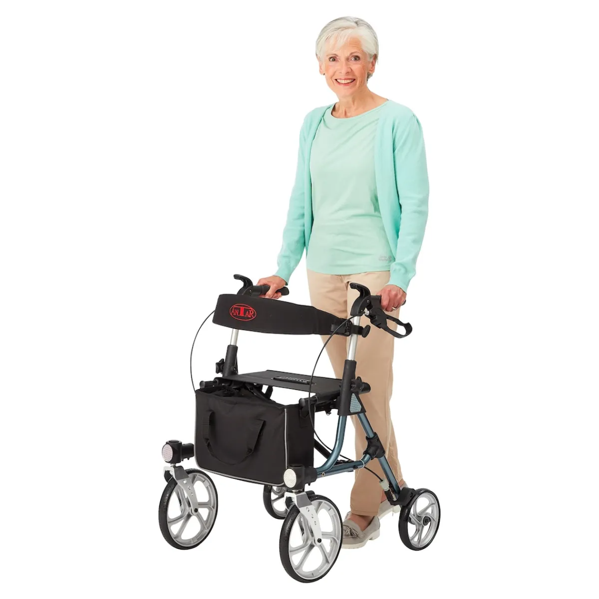 Falten und Entfalten mit nur einer Hand möglich. Große robuste Vorderräder für leichtes Bewegen auf unebenen Flächen. Bequeme Sitzfläche. Höhenverstellbare, rutschfeste Griffe sowie Reflektoren und Feststellbremsen für mehr Sicherheit. Besonders leichter Aluminiumrahmen. Sitzhöhe 50 cm.