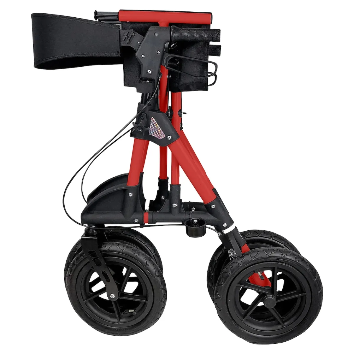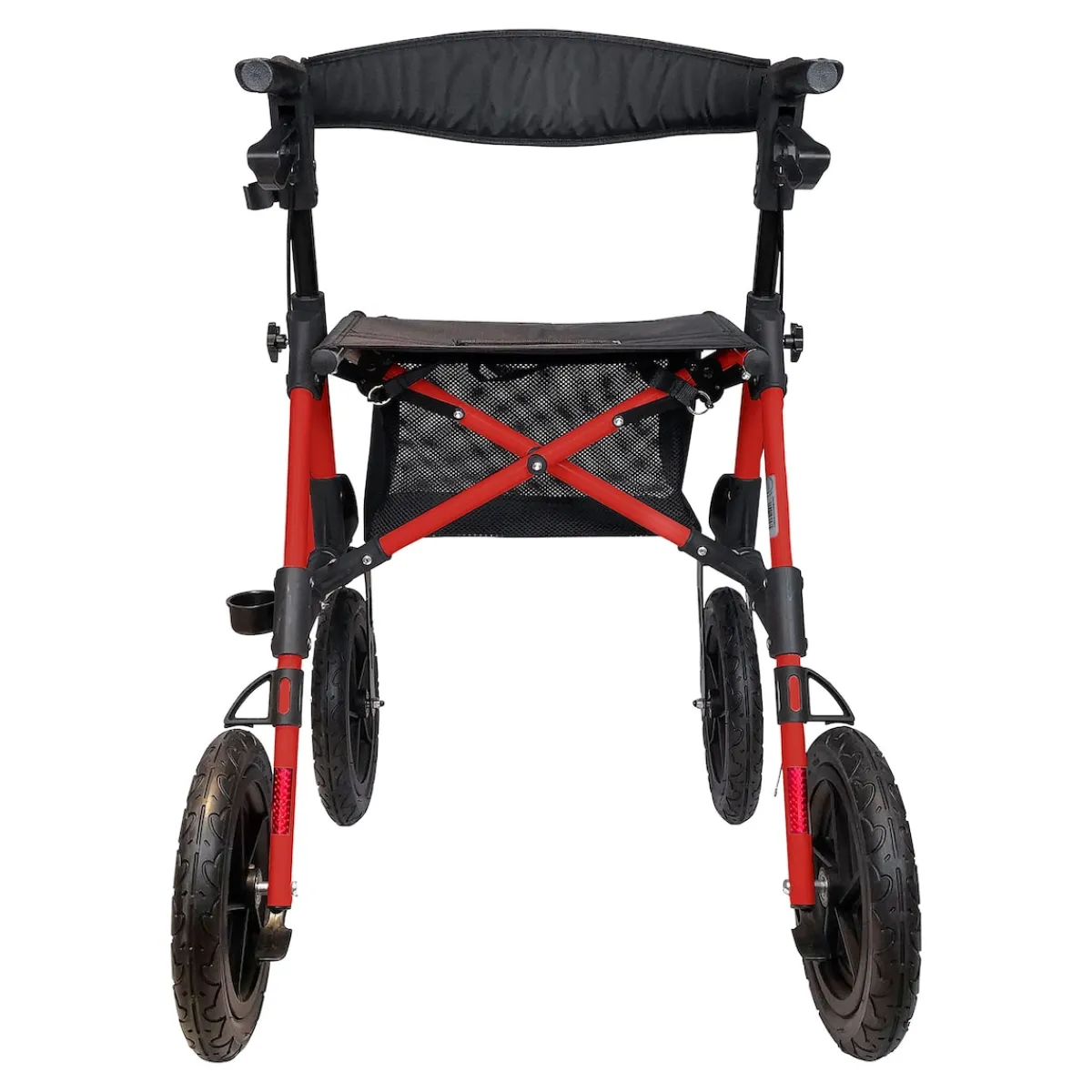 Einen besonders sicheren Halt bieten die in Stufen verstellbaren ergonomischen Griffe und die extra-großen Räder mit Luftbereifung und Profil, die so manche Unebenheit ausgleichen können. Die Ankipphilfe hilft beim Überwinden von Hindernissen und die Feststell- und Betriebsbremse für einen sicheren Stopp, wenn Sie eine Pause einlegen möchten. Dann können Sie es sich auf dem 61 cm hohen Sitz bequem machen und ein Weilchen ausruhen, bevor Sie Ihren Weg fortsetzen. Der 60 cm lange Rückengurt bietet hierbei eine gute Stütze.