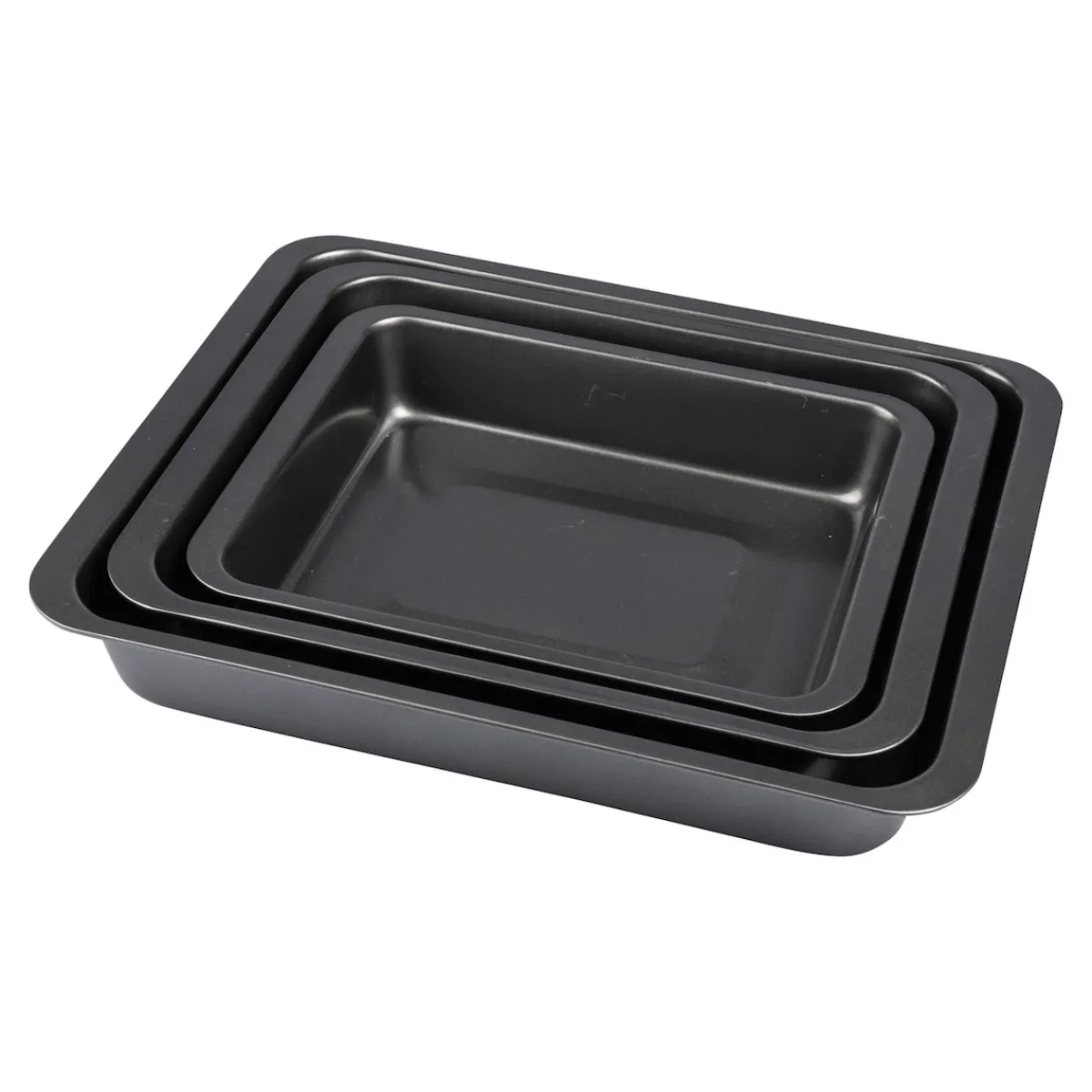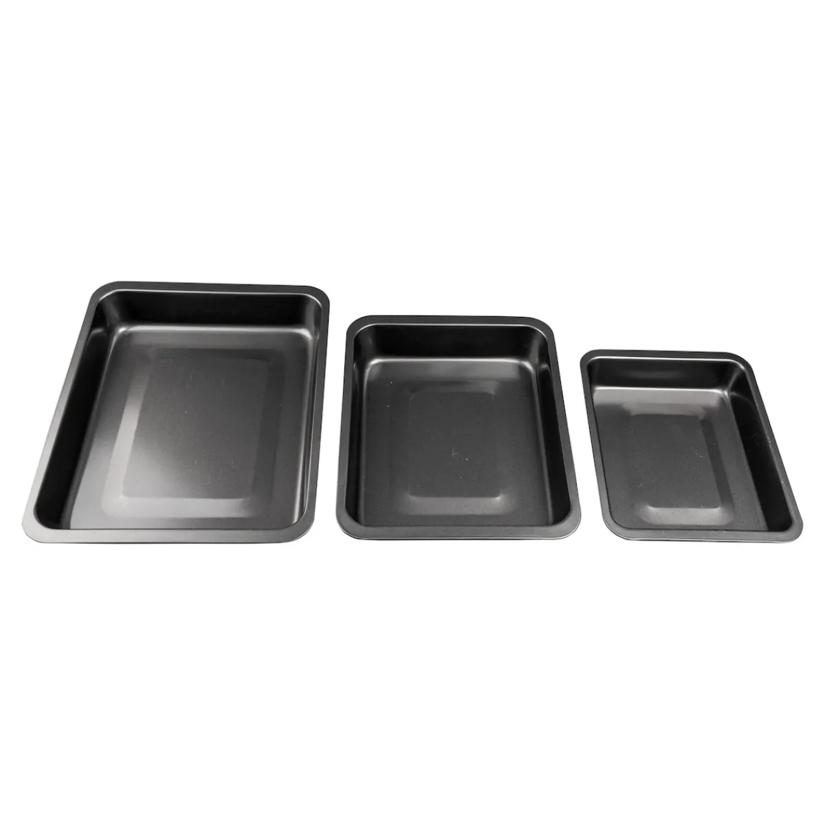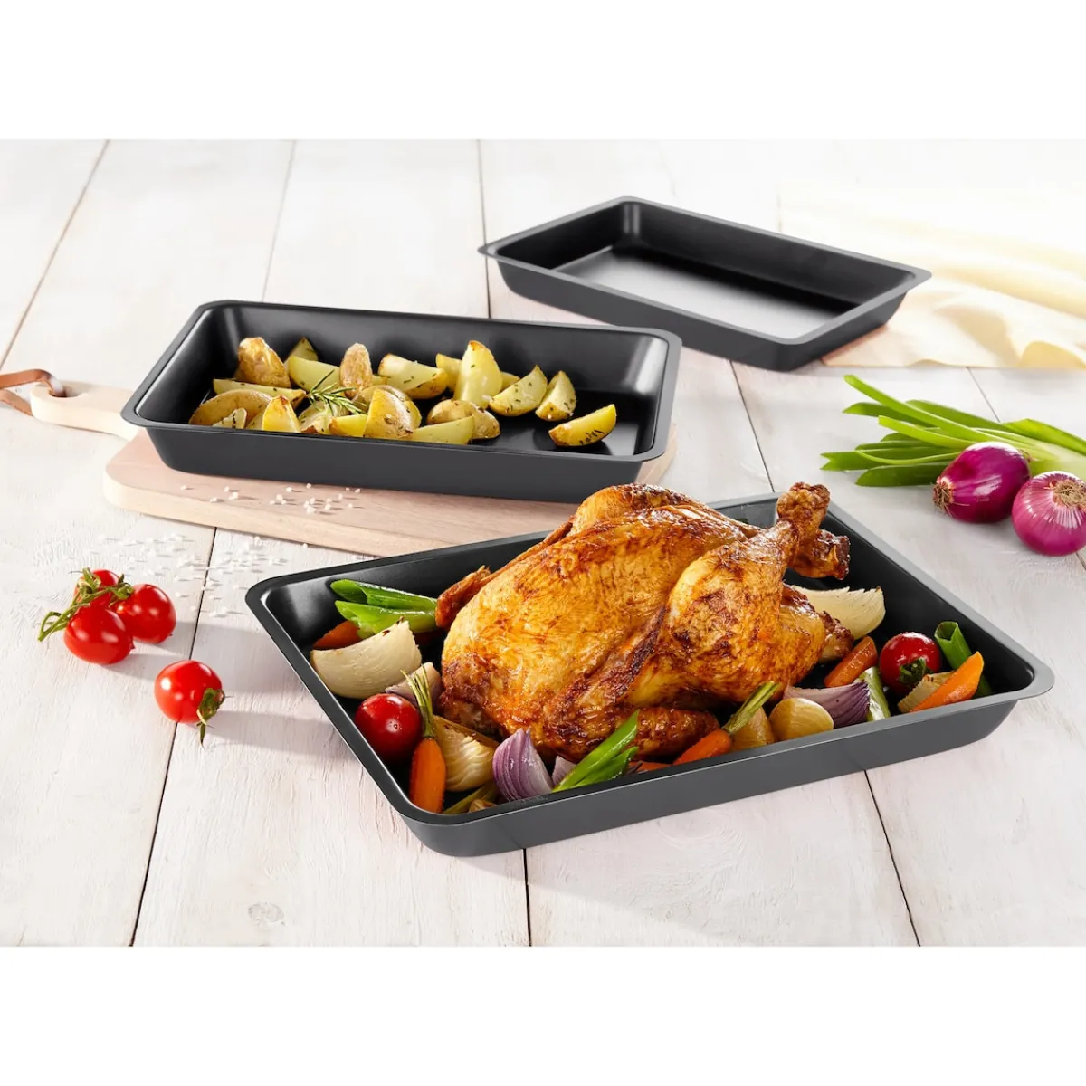 Dieses Set aus 3 Blechen in verschiedenen Größen eignet sich für die unterschiedlichsten Ofengerichte. So haben Sie für Hähnchen, Ofenkartoffeln, Blechkuchen und andere Köstlichkeiten immer die passende Variante zur Hand.