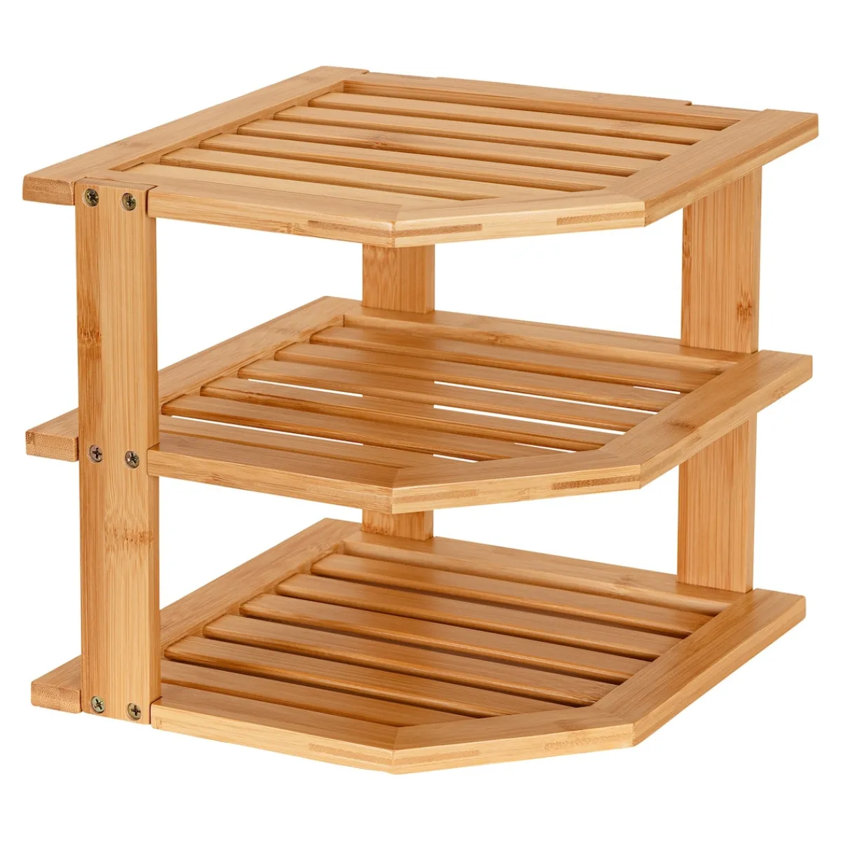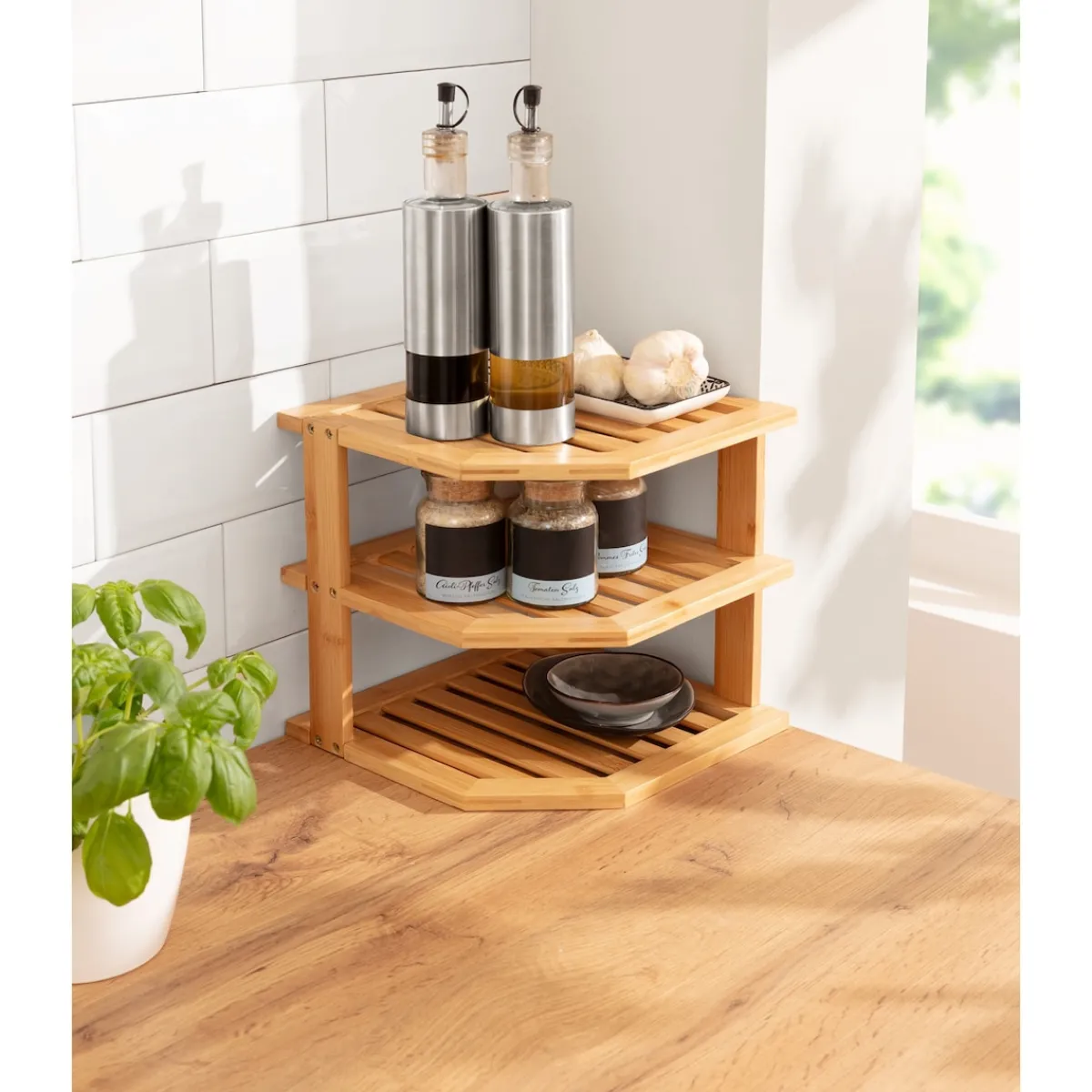 Verwandeln Sie Ecken in praktischen Stauraum: Auf diesem praktischen Orga-Talent finden Gewürze, Küchenutensilien und andere Kleinigkeiten auf 3 Etagen wohlgeordnet Platz. Dank seiner natürlichen Optik passt sich der langlebige Helfer jeder Einrichtung an.