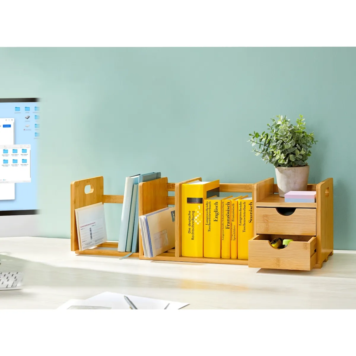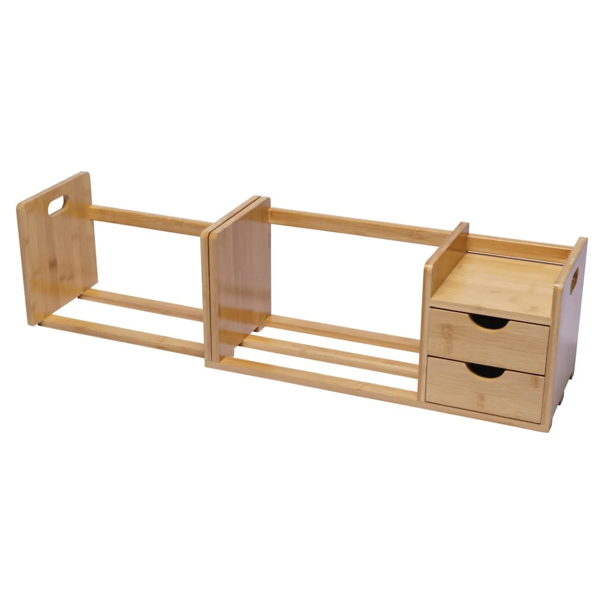 Der flexible Organizer in wunderschönem Bambus mit 2 cleveren Schubladen passt sich ganz Ihrem Bedarf an! Ob in der Küche oder auf dem Schreibtisch: Dieses flexibel ausziehbare Regal schafft viel Platz für alles, was nicht im Weg stehen oder liegen soll.
