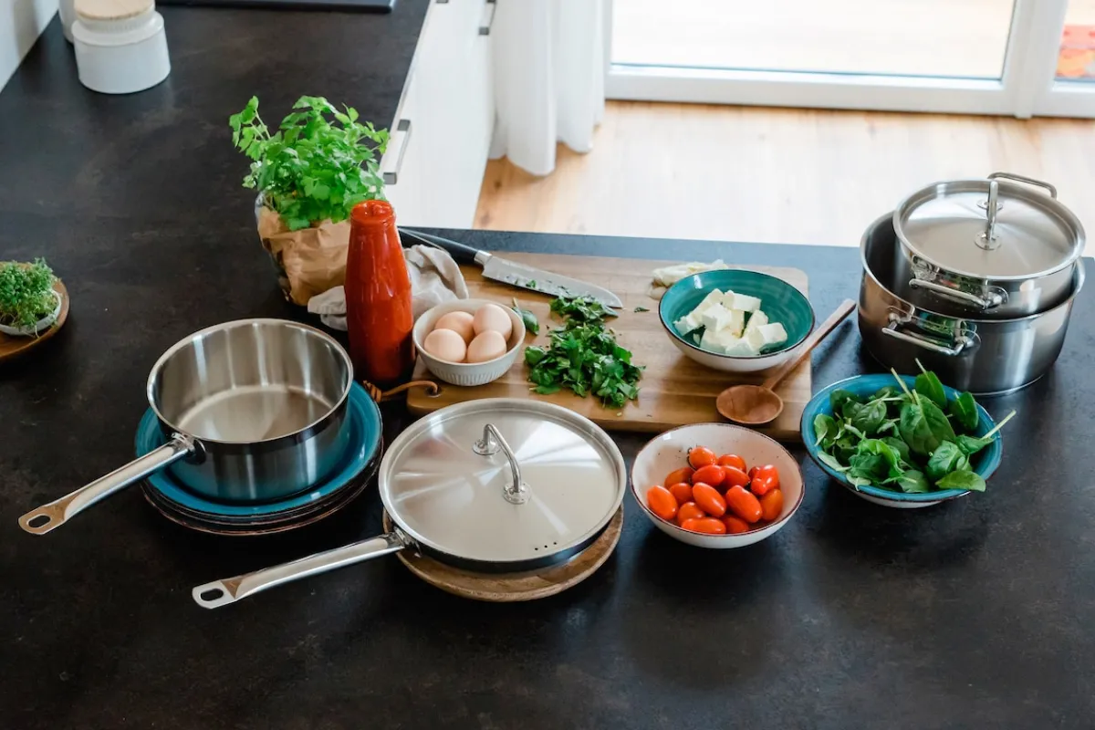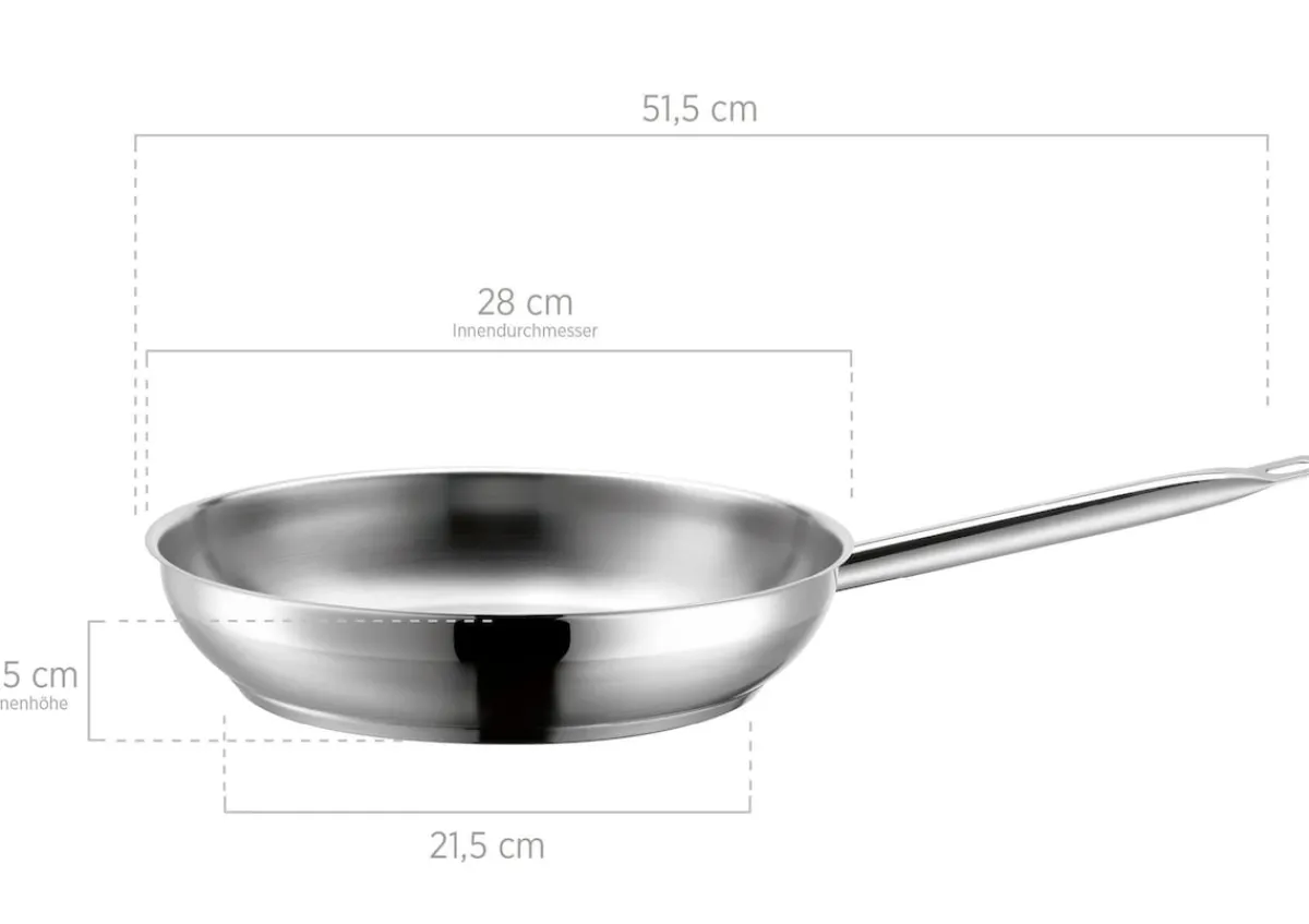 Die Bratpfannen aus Edelstahl sind mit den Durchmessern 24 cm, 28 cm und 32 cm erhältlich.