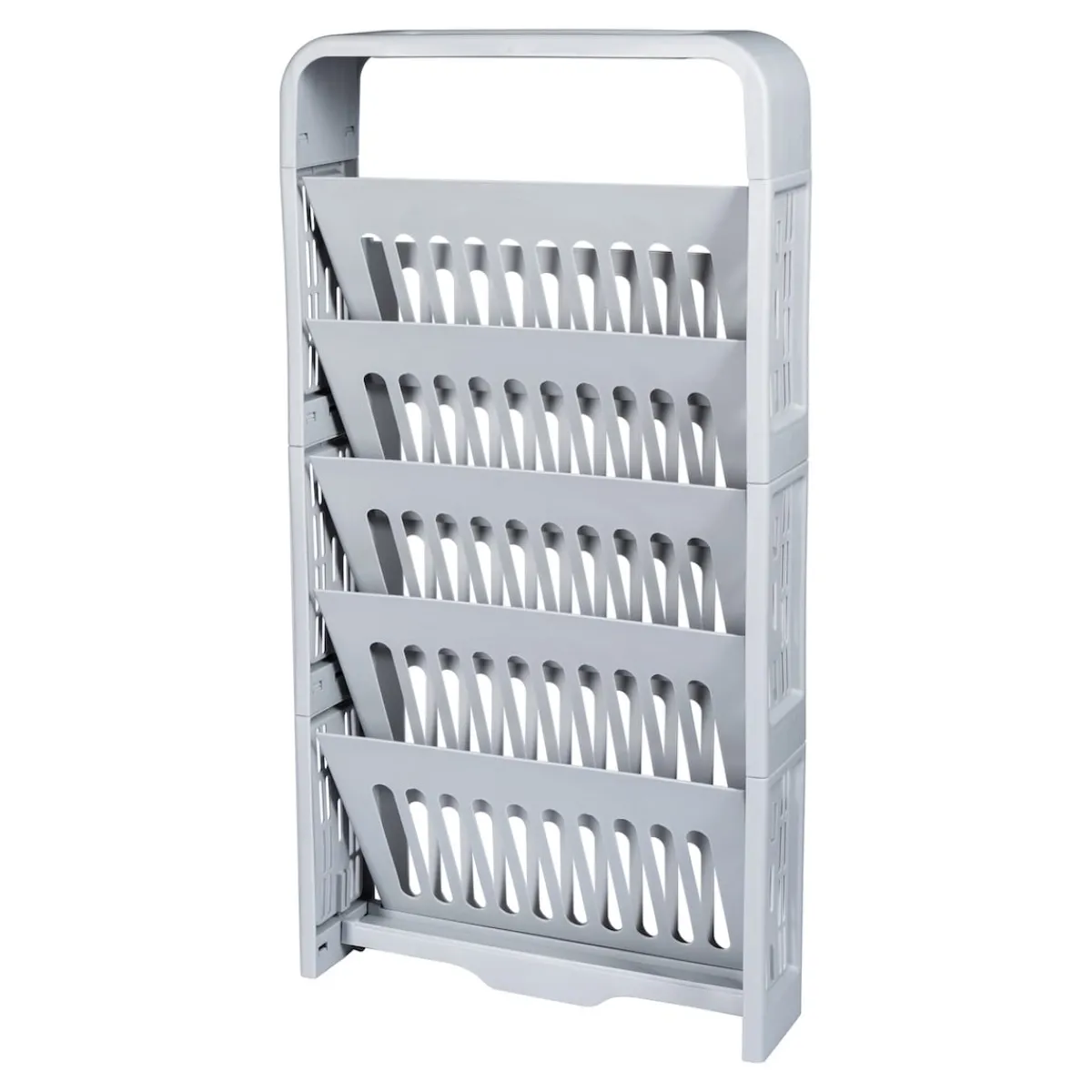 Das schmale Regal bietet auch in kleineren Räumen oder Büros viel Platz für Ihre Dokumente und Zeitschriften. In 5 Fächern haben Sie stets alles griffbereit. Auf der oberen Ablage finden Stifte, Brille und andere kleine Helfer Platz.
