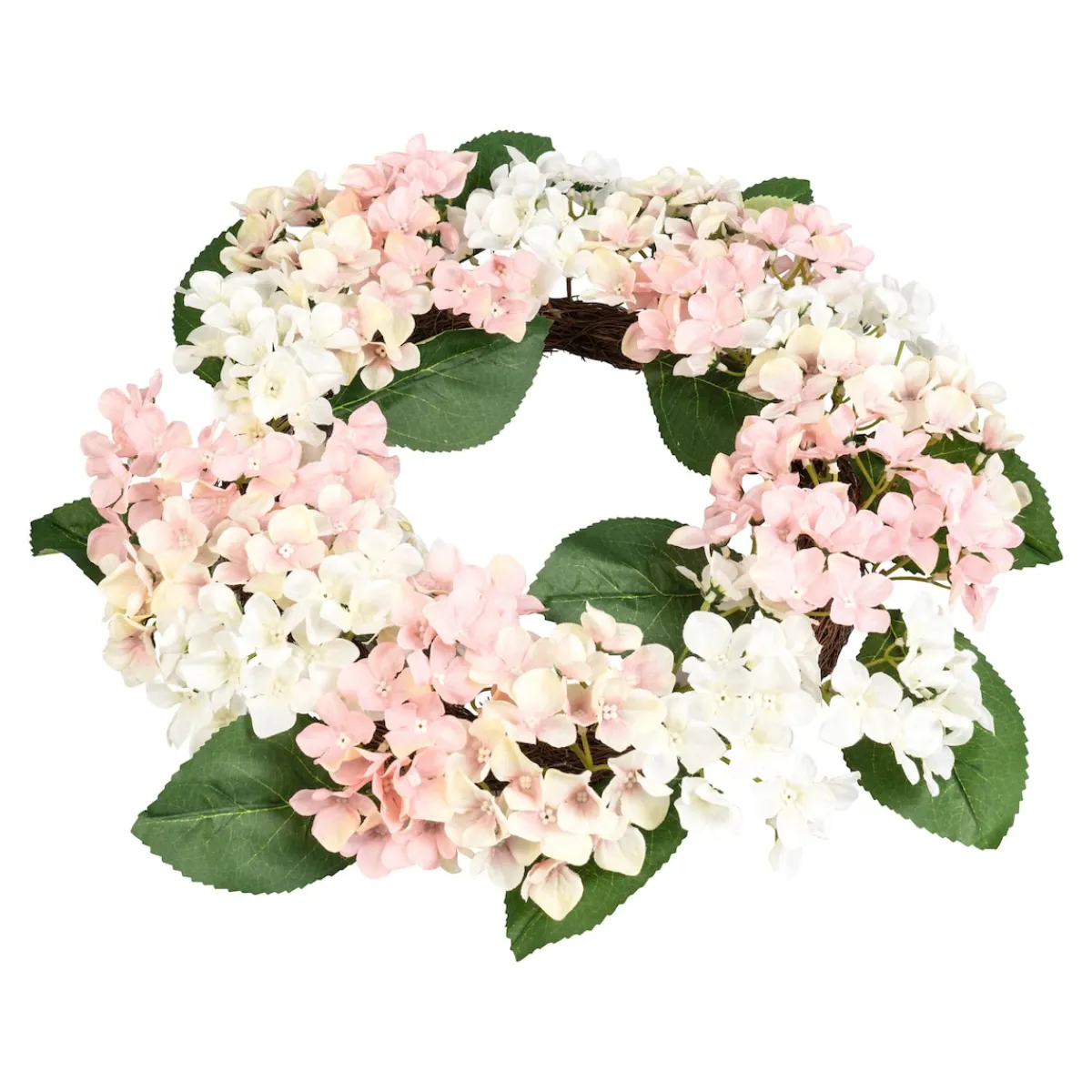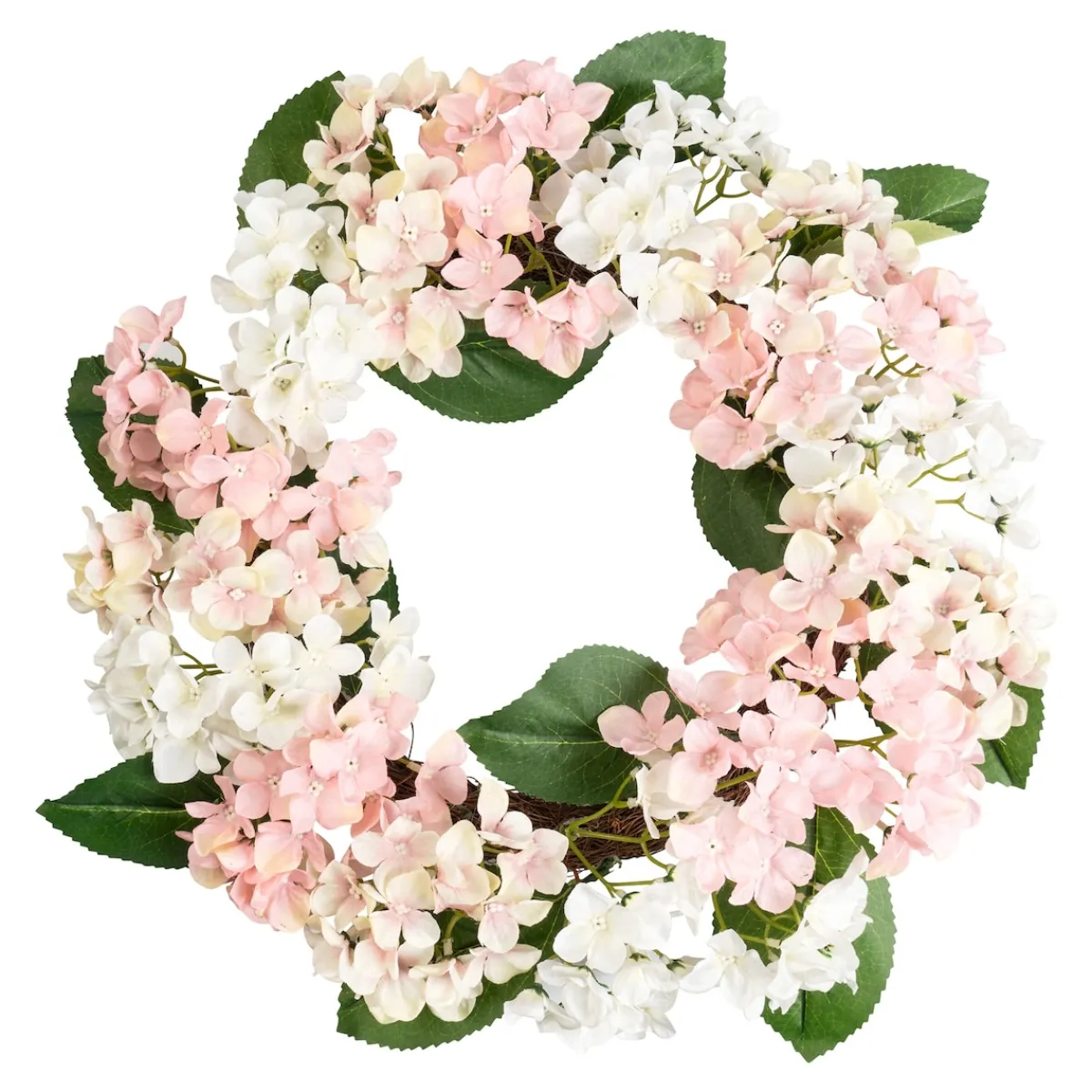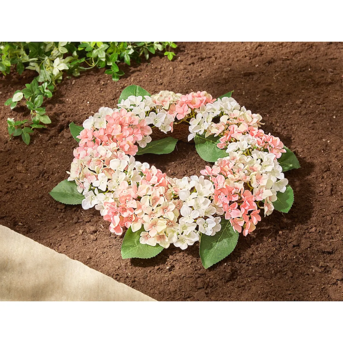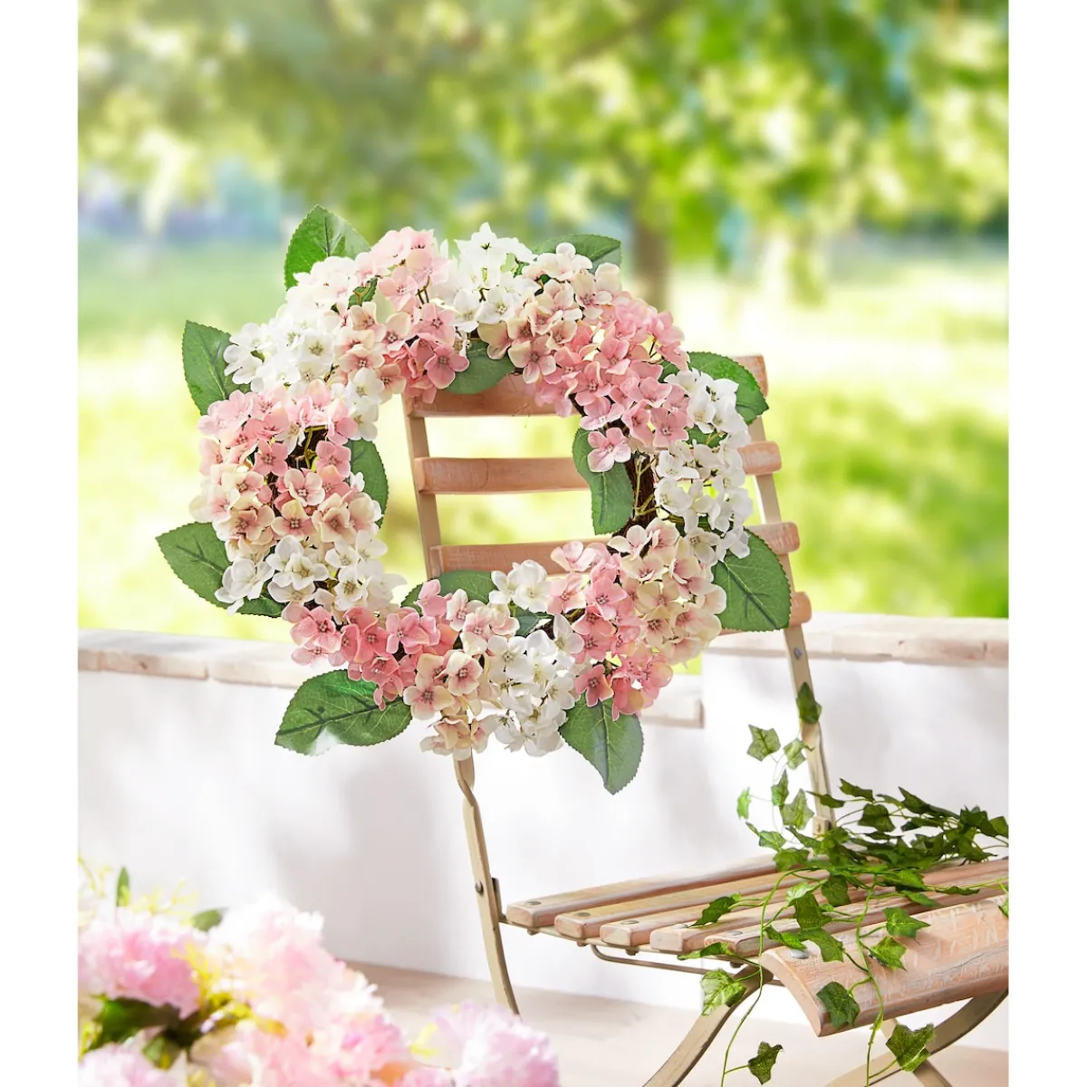 Mit diesem großen Hortensien-Kranz bringen Sie zeitlos schöne, üppige Blütenpracht in Ihr Zuhause. Die rosa-cremefarbenen Blüten präsentieren sich so natürlich, als wären sie gerade frisch gepflückt. Ideal als Türkranz oder Grabdekoration.