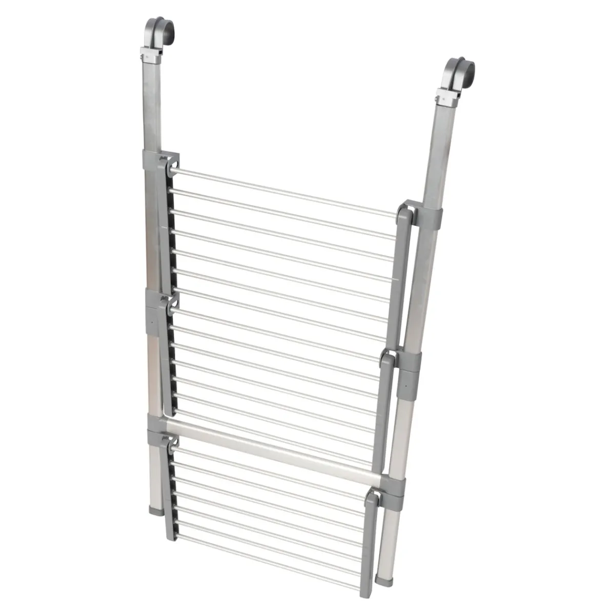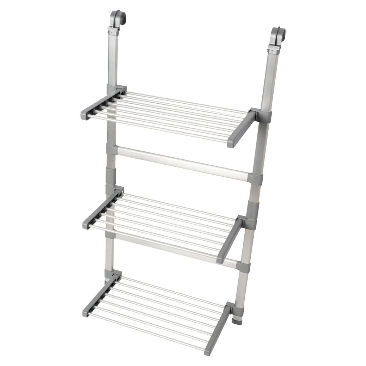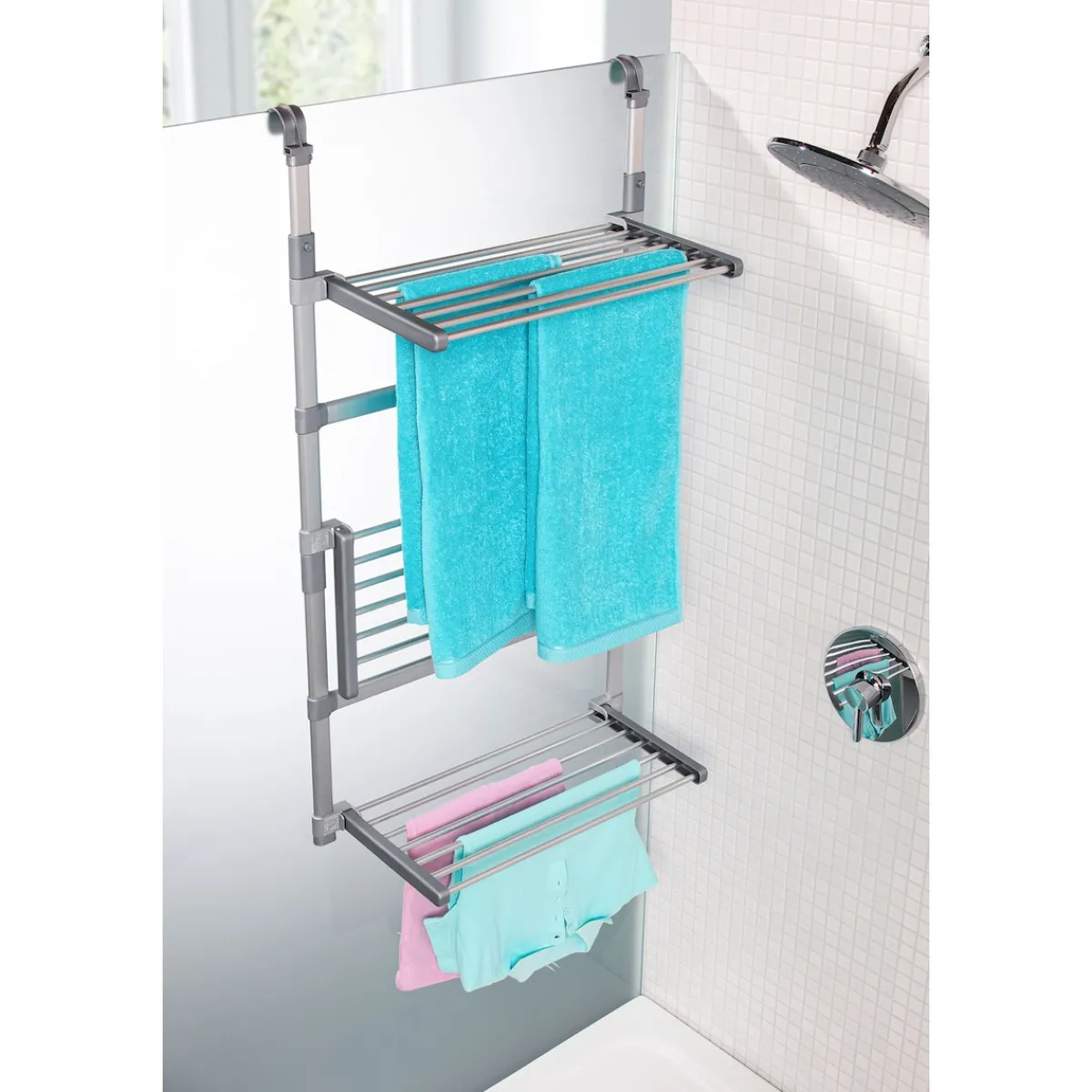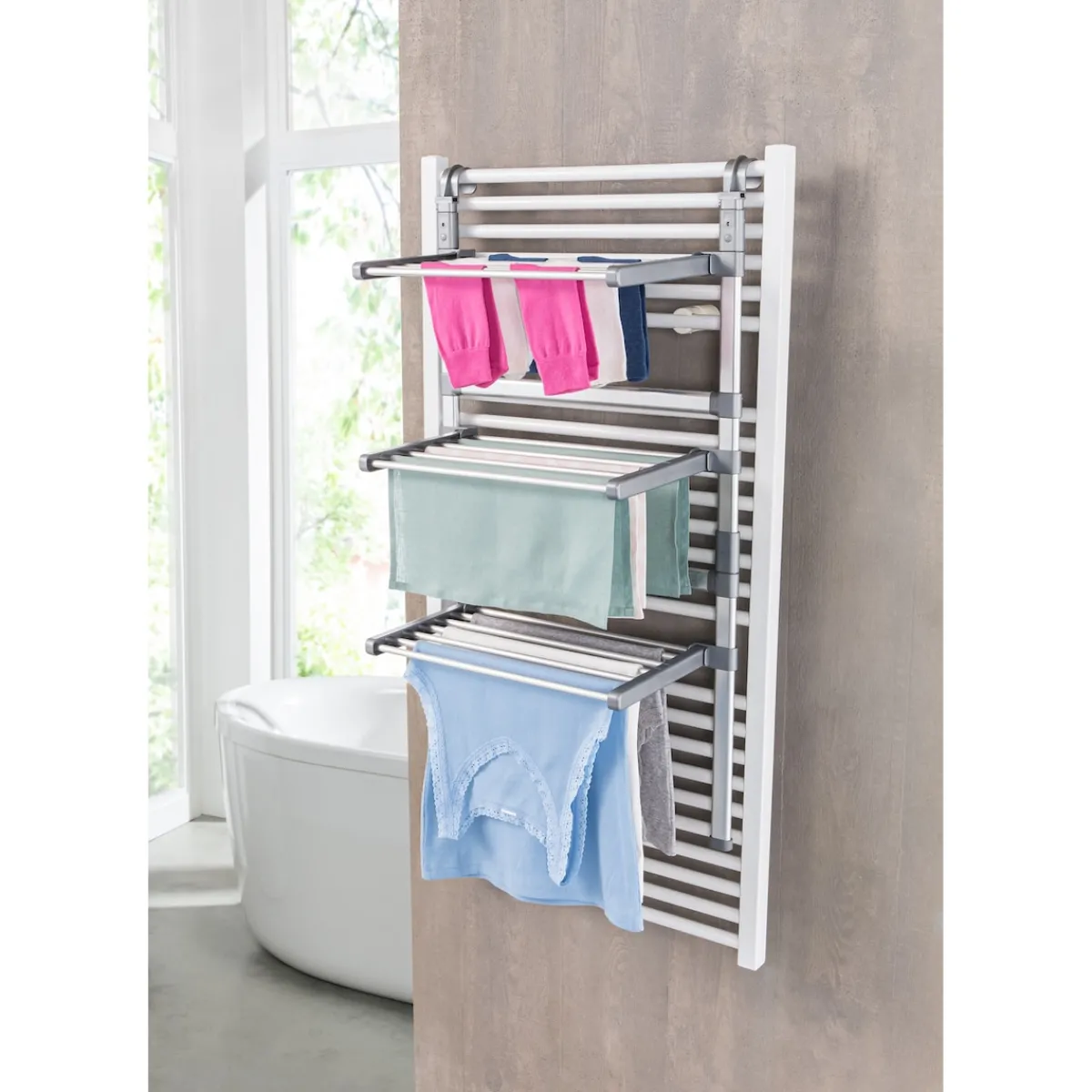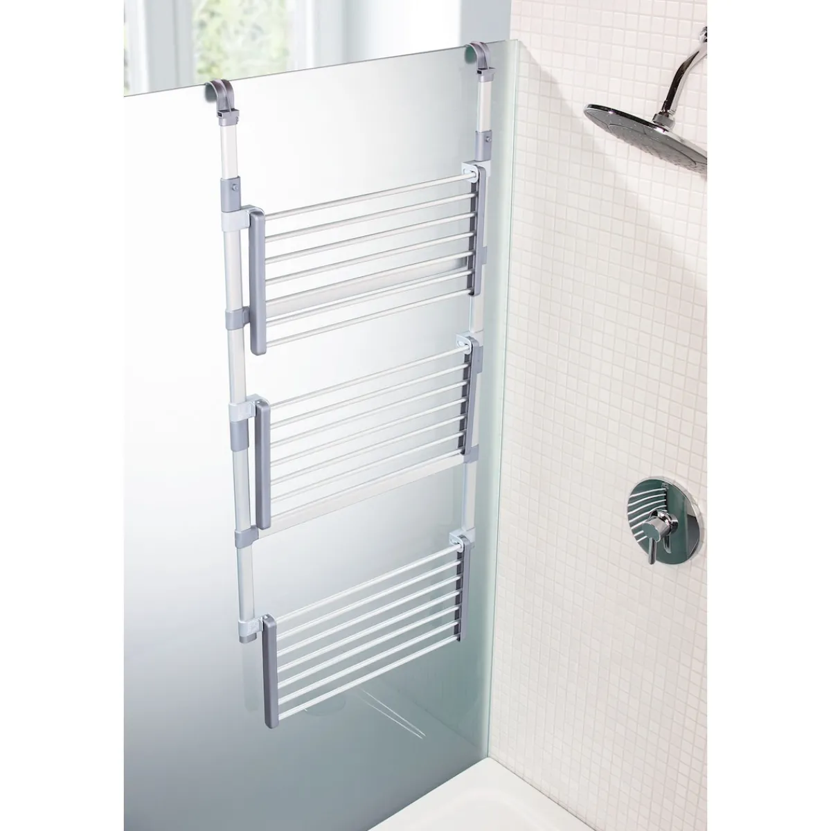Verwandeln Sie Ihre Dusche oder Ihren Heizkörper blitzschnell in einen Trockenplatz für Wäsche: Gestell einfach einhängen und aufklappen. Auch ideal für tropfnasse Wäsche – das Wasser läuft direkt in der Dusche ab.