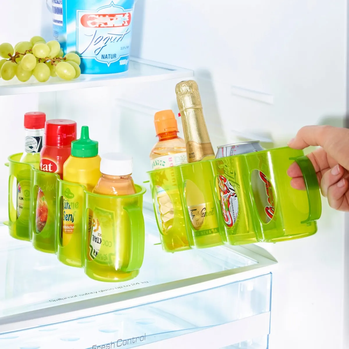Wenn, dann aber richtig! Mit dem speziellen Flaschenfach herrscht endlich Ordnung bei Flaschen und Dosen bis zu Ø 6,5 cm. Ideal für 0,5 – Liter – Dosen, Ketchup, Grillsoßen etc.