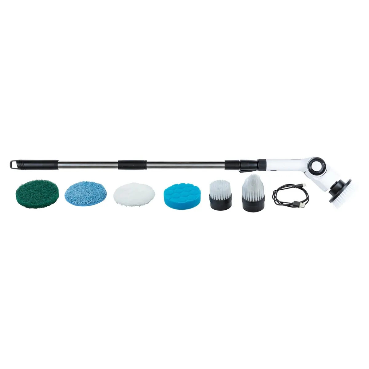 - 3 Bürsten-Aufsätze, 2 Reinigungspads, 2 Reinigungsschwämme, USB-Ladekabel, Teleskopstiel