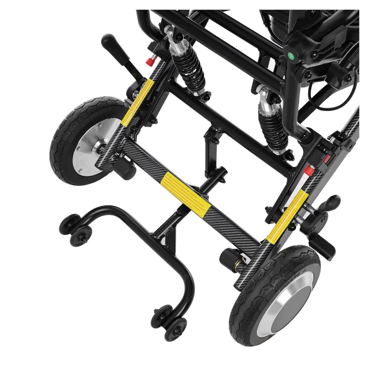 Für zusätzliche Sicherheit sorgen Feststellbremsen und eine Verriegelung, die ein unbeabsichtigtes Zusammenklappen verhindert. Ein Kippschutz sorgt für mehr Stabilität, besonders auf unebenem Gelände.